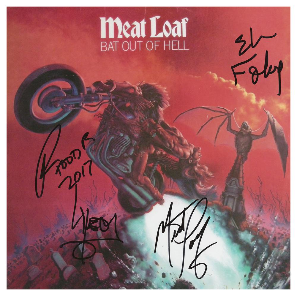Color glossy 12 x 12 photo of the front cover to Meat Loaf's debut album Bat Out of Hell, signed in black felt tip by Meat Loaf, vocalist Ellen Foley, bassist Kasim Sulton, and producer and multi-instrumentalist Todd Rundgren. In fine condition.