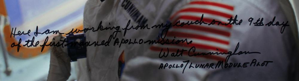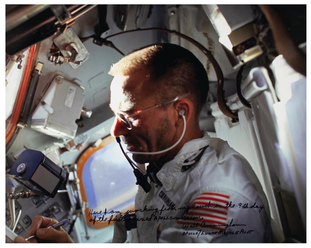 Color satin-finish 20 x 16 close-up photo of LMP Cunningham jotting down notes inside the Apollo CSM-101 spacecraft during the Apollo 7 mission, signed in black felt tip, "Here I am working from my couch on the 9th day of the first manned Apollo mission. Walt Cunningham, Apollo 7 Lunar Module Pilot." In fine condition.