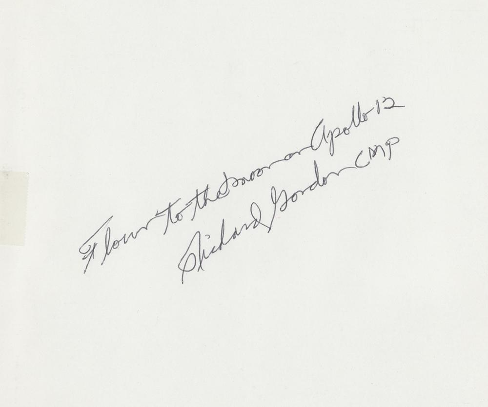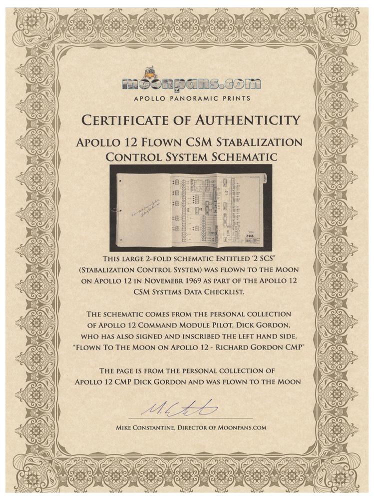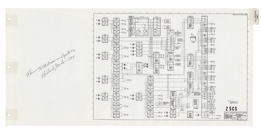 Richard Gordon’s flown Apollo 12 CSM schematic for the ‘Stabilization Control System Overview,’ 22.5 x 10.5, signed and flight-certified in the blank first panel in black ballpoint, "Flown to the moon on Apollo 12, Richard Gordon CMP." The schematic bears an affixed tab on the right edge, "SCS Overview (PWR)," and diagrams the flow of the SCS, in relation to the Electrical Power System and Body-Mounted Attitude Gyro, which terminate at the Rotational and Translational Hand Controllers. In fine condition. Accompanied by a photo of Gordon holding the schematic, and by a certificate of authenticity from Moonpans, which states: "This large 2-fold schematic?was flown to the moon on Apollo 12?as part of the Apollo 12 CSM Systems Data Checklist. The Schematic comes from the personal collection of Apollo 12 Command Module Pilot, Dick Gordon." The Stabilization and Control System provides a capability for monitoring and controlling the attitude of the spacecraft, for translational maneuvers, and SPS thrust vector control. The SCS also serves as the backup system for the Primary Guidance, Navigation and Control System (PGNCS), which is essentially the Apollo Guidance Computer.