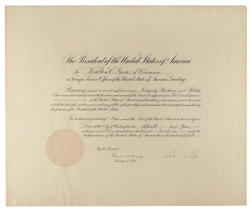 Partly-printed DS as president, one page, 23 x 19.25, June 15, 1926. President Coolidge appoints Walton C. Ferris of Wisconsin, "a Foreign Service Officer of the United States of America" as a "Vice Consul of career." Signed at the conclusion by Calvin Coolidge, and countersigned by Secretary of State Frank B. Kellogg. Original beige wafer seal remains affixed to the lower left. In fine condition, with some edge creasing.