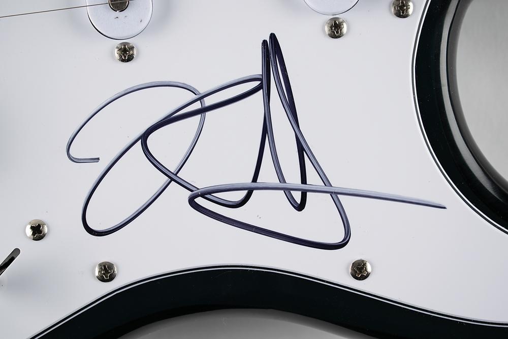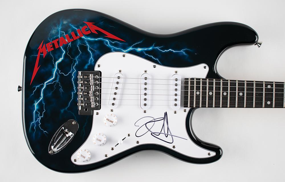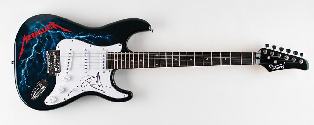 Very appealing black-bodied Glarry Stratocaster-style electric guitar with a lightning bolt finish and affixed Metallica sticker, signed on the white pickguard in black felt tip by Kirk Hammett. In fine condition. A sweet signed guitar that invokes the thrash-tastic riffs of Ride the Lightning.