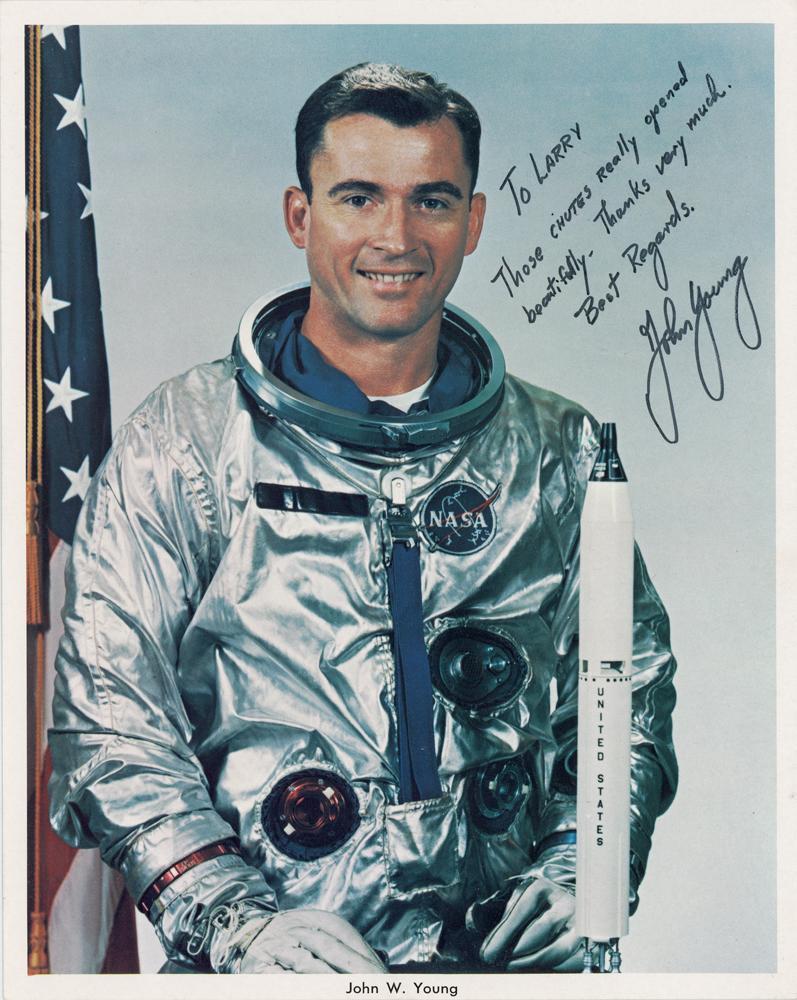 Official color 8 x 10 NASA lithograph of John Young posing in his silver Gemini space suit next to a model of a Titan rocket, signed and inscribed in black felt tip, "To Larry, Those chutes really opened beautifully. Thanks very much. Best regards. John Young.” In very fine condition. Larry Richardson, the recipient of the photo, was a former Northrup engineer and parachute rigger.