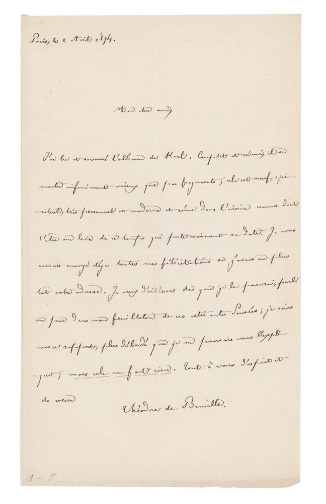 French poet and writer (1823-1891) whose work was influential in the Symbolist movement. ALS in French, one page, 5 x 8.25, April 2, 1874. Untranslated handwritten letter by Theodore de Banville. In fine condition, with light show-through along the left edge from a thin mounting strip on the back.