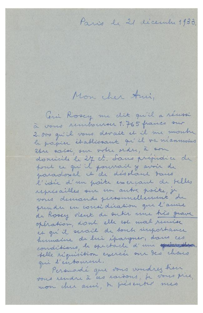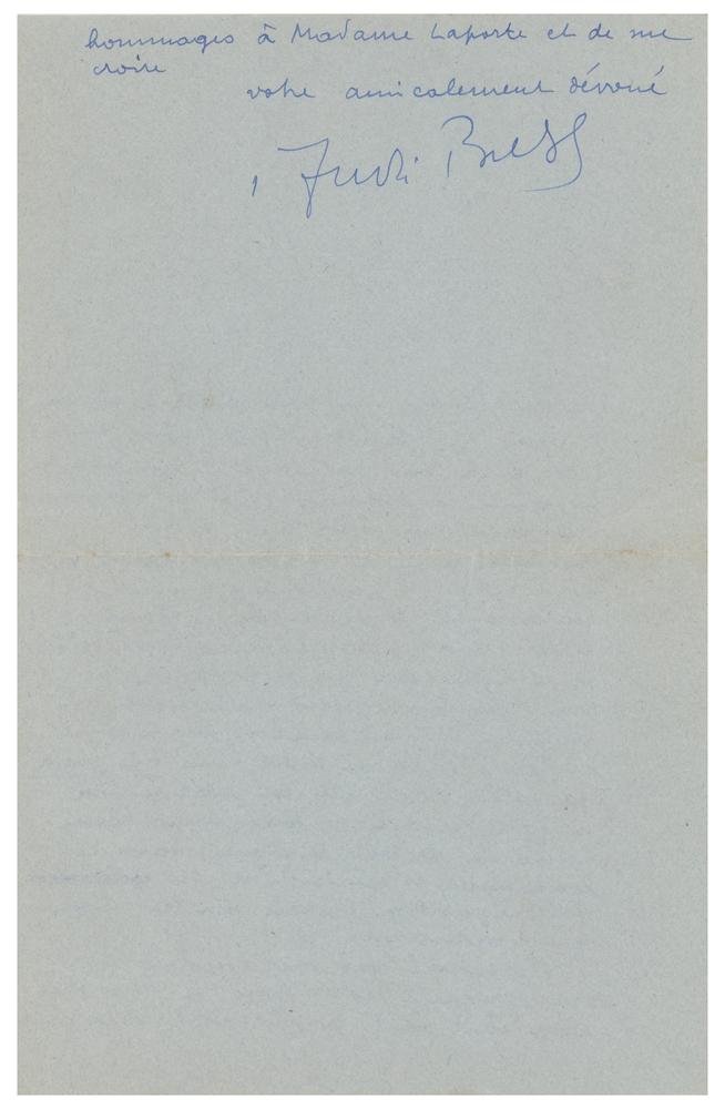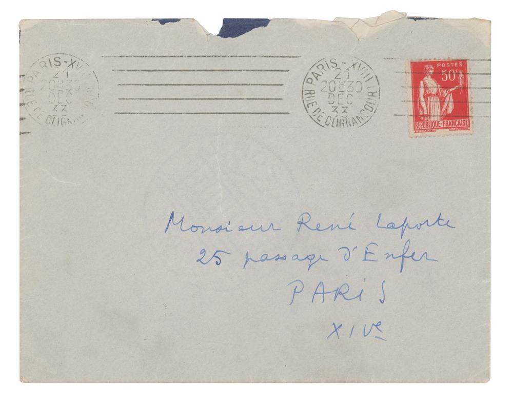 French writer and poet (1896-1966) best known as the founder of Surrealism. ALS in French, one page both sides, 5.25 x 8.25, December 21, 1933. Handwritten letter by Andre Breton, addressed to writer Rene Laporte, where he tries to mediate a conflict between Laporte and the poet Gui Rosey. In part (translated): "[For all] that may be paradoxical and distressing in the idea of a poet exercising retaliation over another poet.” In fine condition. Accompanied by the original mailing envelope addressed in Breton's hand.