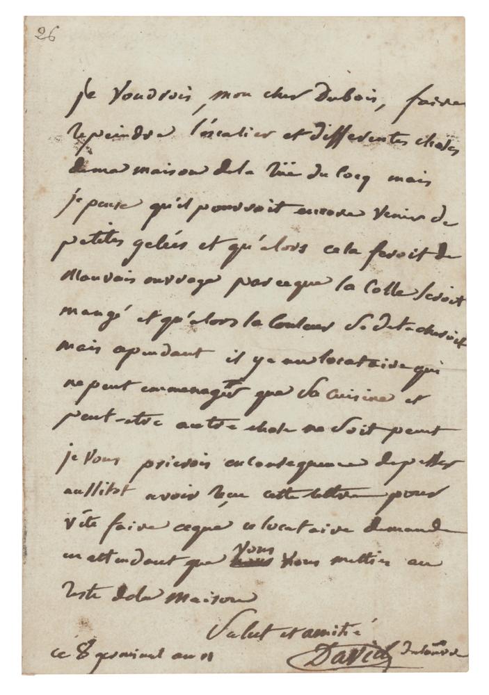 French painter (1748-1825) and master of the Neoclassical style whose most famous works include 'The Death of Marat' and several portraits of Napoleon Bonaparte. ALS in French, signed “David,” one page, 4.5 x 6.75, no date. Handwritten letter by Jacques-Louis David to his to his employee Dubois. The greatest and most powerful of Napoleon’s artists gives instructions to his assistant on the manner by which he desires the interior of his house to be repainted. In part (translated): "I would like my dear Dubois to have the staircase and different rooms repainted in my house in the Rue du Cocq, but I think that some small freezings could still occur and that could cause some bad work because the glue would be eaten and then the colors would detach themselves from the wall. But meanwhile, there is one tenant who cannot get into his rooms before his kitchen is ready and perhaps something else he needs. I would therefore ask you to go as soon as you get this letter and act swiftly to do what the tenant asks while we wait that you can coordinate the painting on the rest of the house." In fine condition.
