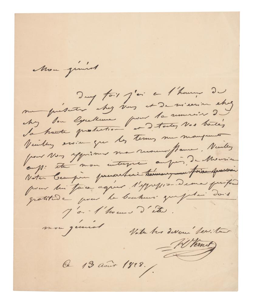 French painter (1789-1863) known for his battle scenes. ALS in French, signed “H. Vernet,” one page, 7.25 x 9, August 13, 1828. Untranslated handwritten letter by Horace Vernet. In very good to fine condition, with light creasing along the right edge.
