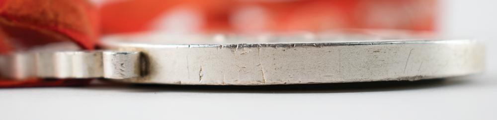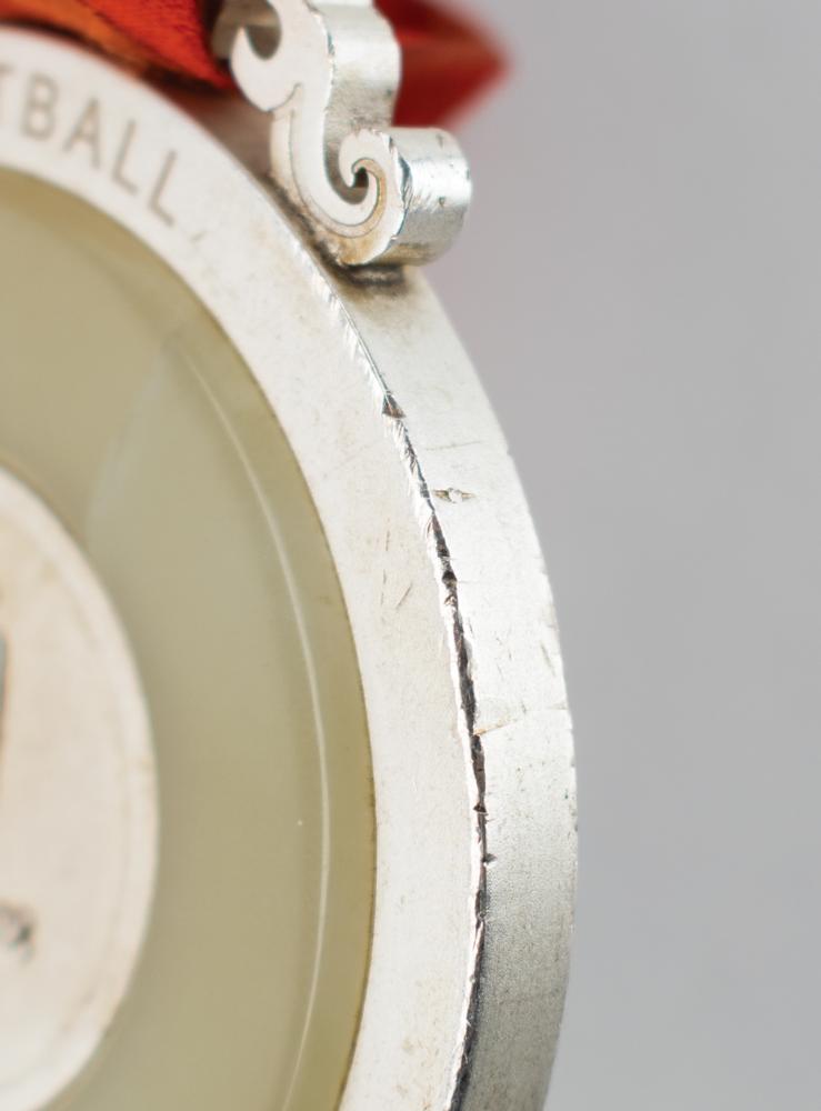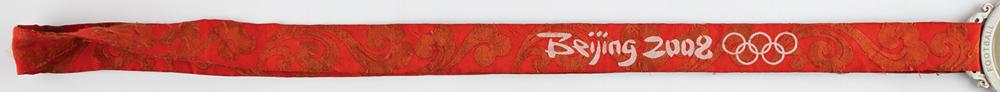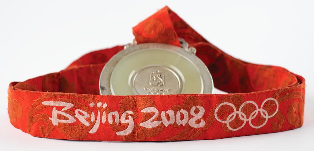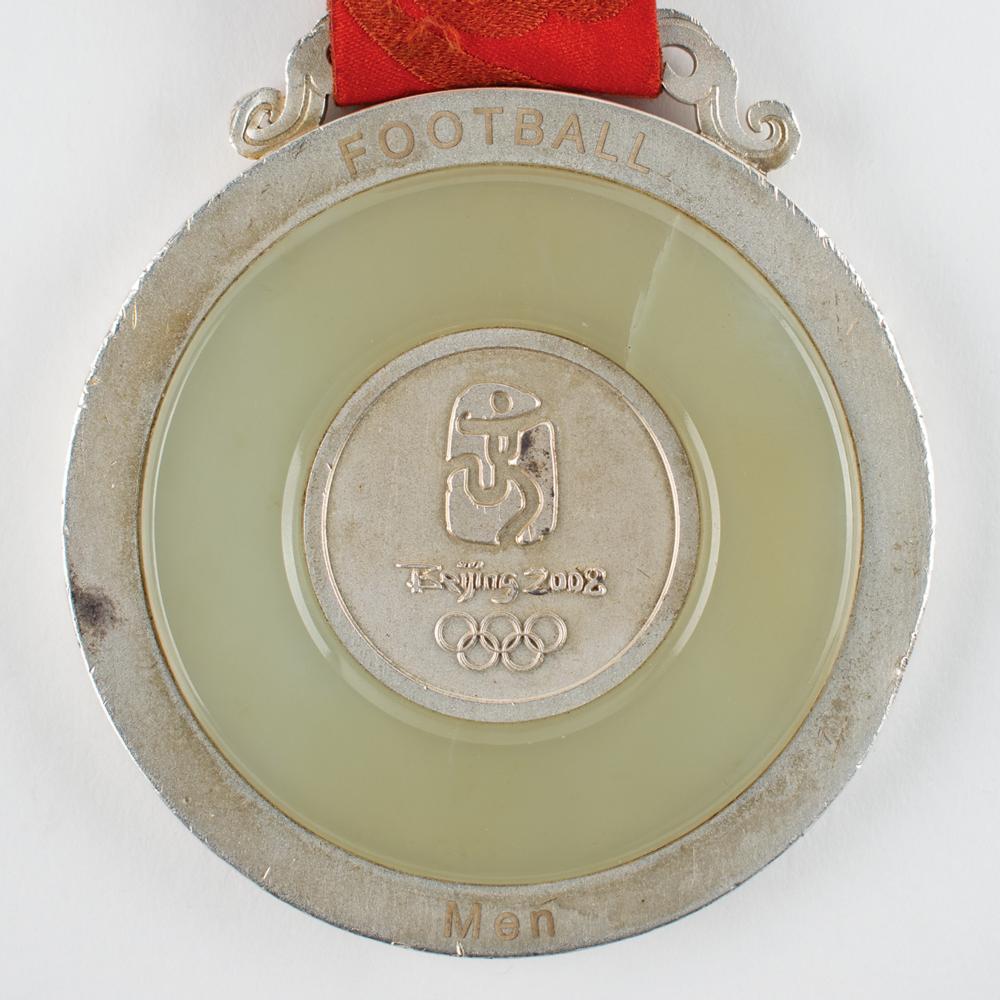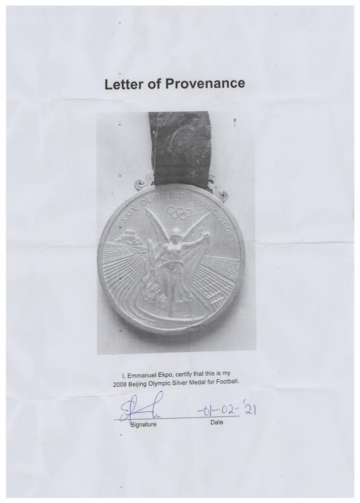 Winner’s medal awarded to Nigerian footballer Emmanuel Ekpo at the Beijing 2008 Summer Olympics. Silver with inlaid jade, 70 mm, 186 gm, by Medal Design Group, China Central Academy of Fine Arts, Elena Votsi. Created from ancient Chinese jade patterns, the medal consists of silver and jade, which symbolize nobility and virtue. Jade has been regarded as a virtue since ancient times, and the embodiment of Chinese traditional values of ethics and honor. The front depicts the standing goddess of Victory against panoramic imagery of the Panathinaikos Arena, with text above reading: “XXIX Olympiad Beijing 2008”; and the reverse features the Beijing Games emblem surrounded by inlaid jade and the outer circle engraved with the sport, “Football, Men.” The design inspiration of the medal hook derives from jade ‘huang,’ a ceremonial jade piece decorated with a double dragon pattern and ‘Pu,’ the reed mat pattern. The medal bears some instances of scuffing, discoloration, and some scattered abrasions to rim and edge. Includes the original well-worn red-and-orange ribbon. Accompanied by a signed letter of provenance from Ekpo.