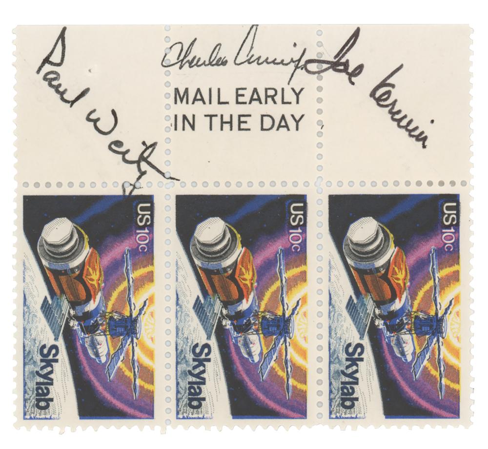 Block of three 10-cent stamps with colorful images of Skylab, 3 x 2.5, signed in the blank borders in black ink by the Skylab 2 crew of Charles Conrad, Paul Weitz, and Joe Kerwin. In fine condition.