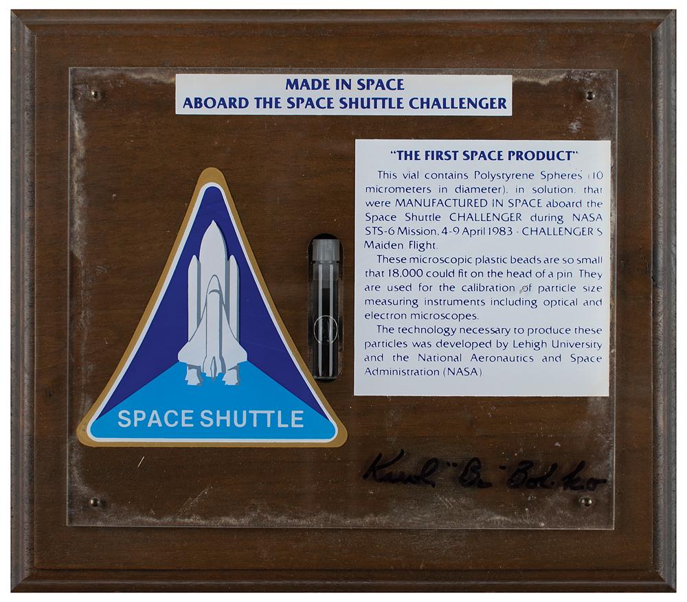 Limited edition commemorative plaque containing a 1.75″ vial of polystyrene spheres, a material manufactured in space aboard the Space Shuttle Challenger during the STS-6 mission. The vial is housed within an 8″ x 7″ wooden plaque, numbered CM 1199, and displayed under a Plexiglas cover with Space Shuttle emblem and an information caption certifying its flown status: “These microscopic plastic beads are so small that 18,000 could fit on the head of a pin. They are used for the calibration of particle size measuring instruments including optical and electron microscopes.” The cover is signed in black felt tip by Pilot Karol J. Bobko. In fine condition.