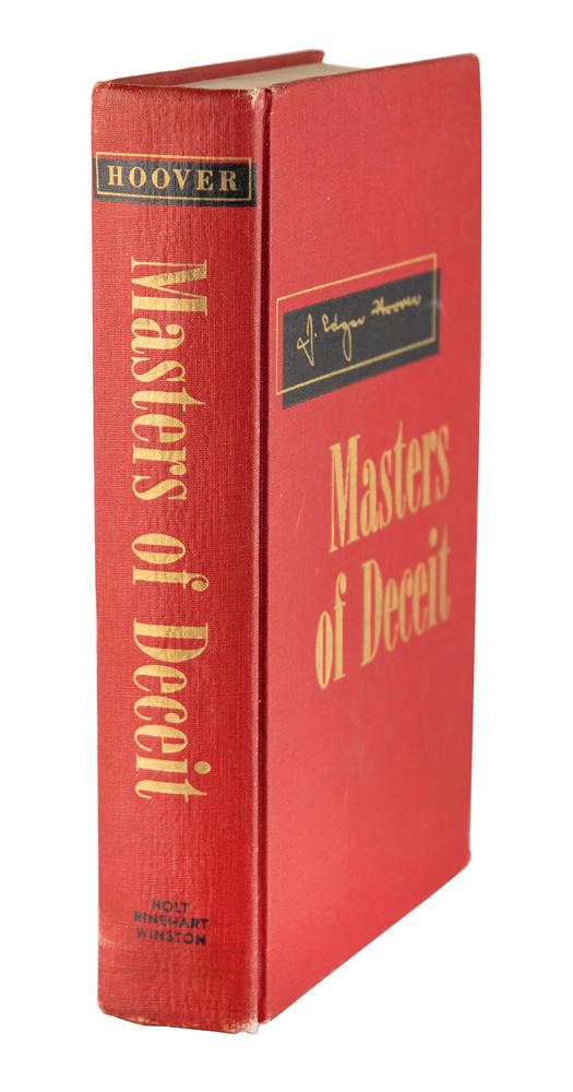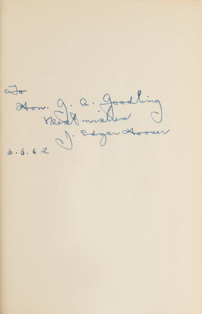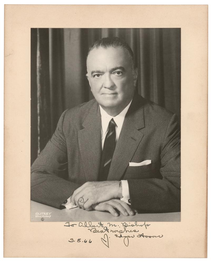 Two items: a matte-finish 6.5 x 8.5 portrait of the FBI director by Autrey of Hollywood, affixed to its original 9 x 11.25 mount, signed and inscribed on the mount in fountain pen, "To Albert M. Bishop, Best wishes, J. Edgar Hoover, 3.8.66"; and a later hardcover printing of Masters of Deceit, published by Holt, Rinehart and Winston in 1961, signed and inscribed on the first free end page in fountain pen, "To Hon. G. A. Goodling, Best wishes, J. Edgar Hoover, 6.6.62." In overall fine condition, with tape remnants to the back of the photo.
