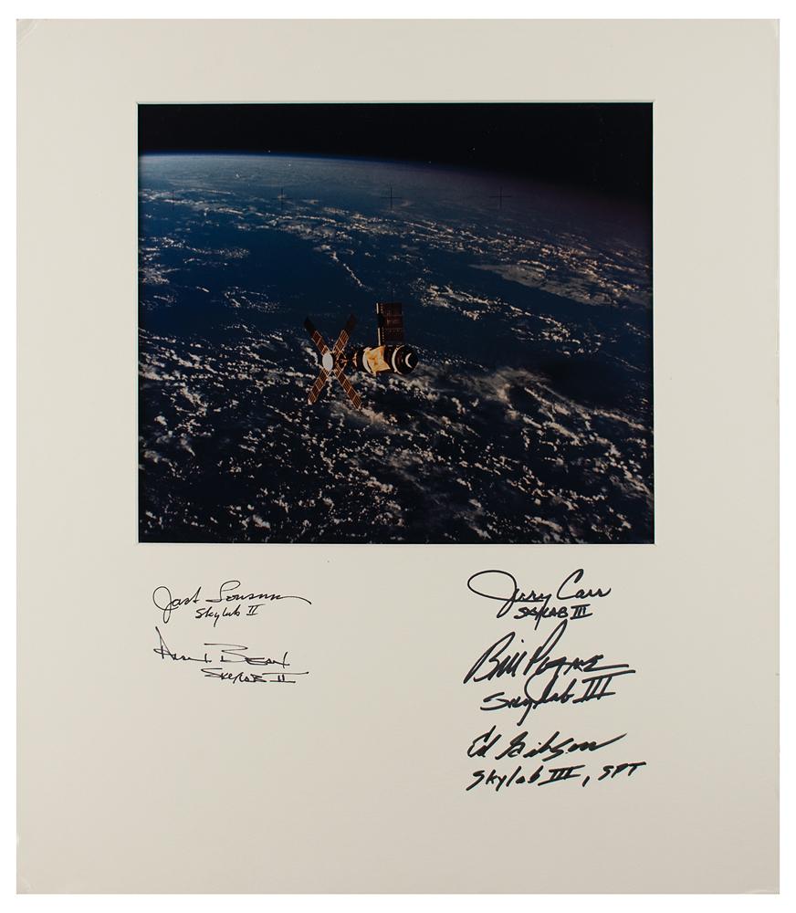 Official color semi-glossy 8.75 x 7.5 NASA lithograph of the Skylab space station floating high above Earth, matted to an overall size of 13 x 15, signed on the mat in black felt tip by five members of the Skylab 3 and 4 missions: "Jack Lousma, Skylab II," "Alan Bean, Skylab II," "Jerry Carr, Skylab III," "Bill Pogue, Skylab III," and "Ed Gibson, Skylab III, SPT." In fine condition, with some bumping to mat edges, which could be easily framed out if so desired.