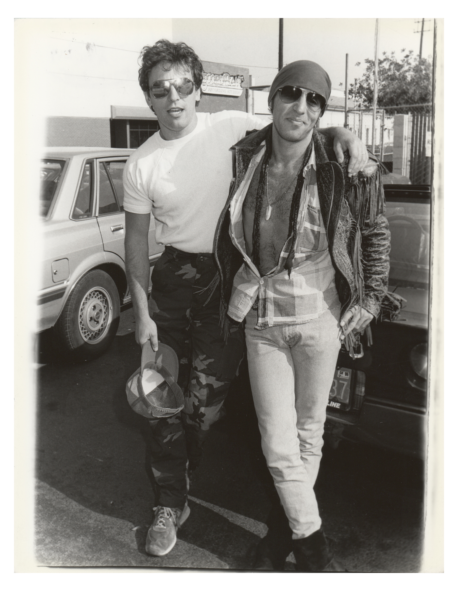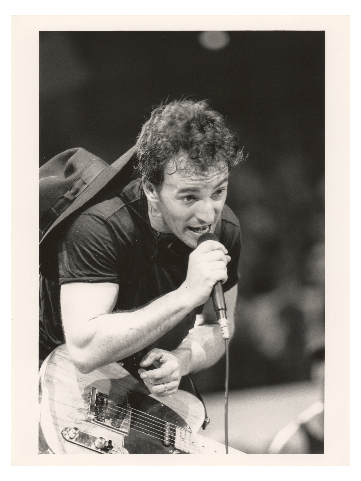 Two original glossy silver gelatin photographs: a 7 x 9 photo of Springsteen with Steven Van Zandt outside the Record Plant recording studio in 1986, taken by Janet Gough; and a 6 x 8 photo of Springsteen singing, taken by Kevin Mazur. Both bear London Features International copyright stamps and labels on the reverse. In overall fine condition, with yellowing to the edges of the larger photo.