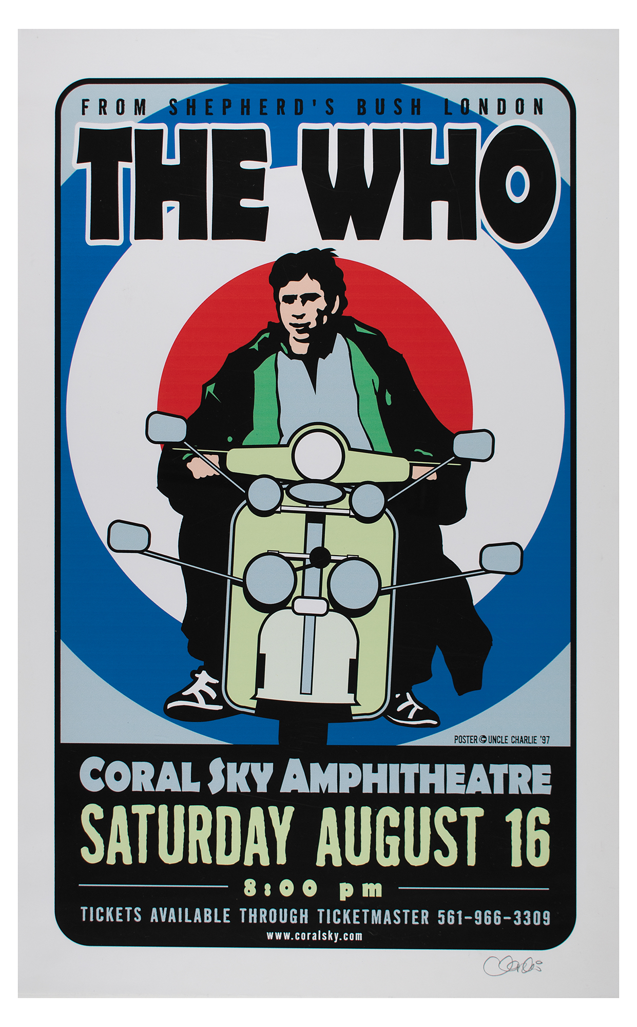 Color 18 x 29 concert poster for The Who at the Coral Sky Amphitheatre on August 16, 1997, signed in the lower border in pencil by the artist, Uncle Charlie Hardwick. In fine condition.