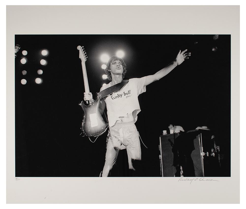 Limited edition 24 x 20.5 print of Mick Jagger with his guitar on stage, numbered 3/50, signed in the lower border in pencil by rock photographer Richard E. Aaron. In fine condition.