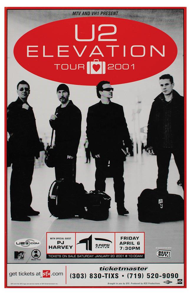 Original 11 x 17 concert poster for U2's Elevation Tour in 2001, presented by MTV and VH1. In fine condition.