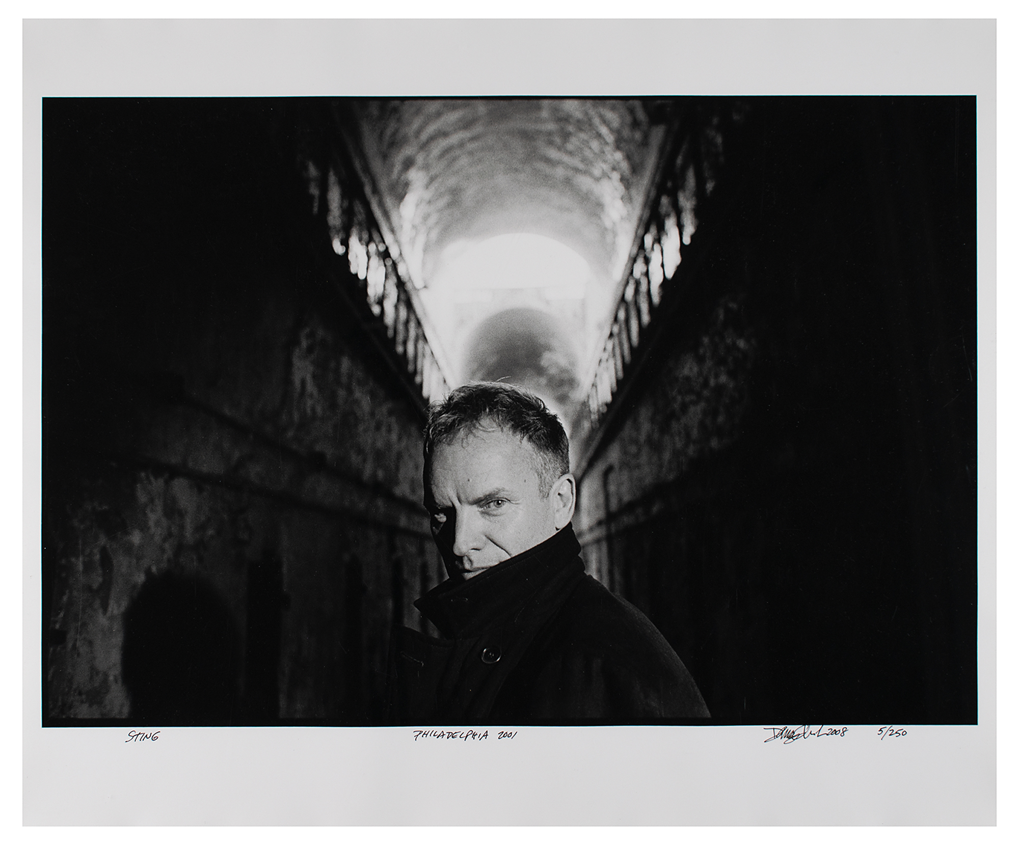 Limited edition glossy 24 x 20 silver gelatin photograph of Sting in an overcoat, numbered 5/250, tilted and signed in the lower border in black felt tip by the photographer, "Sting, Philadelphia 2001, Danny Clinch 2008." In fine condition.