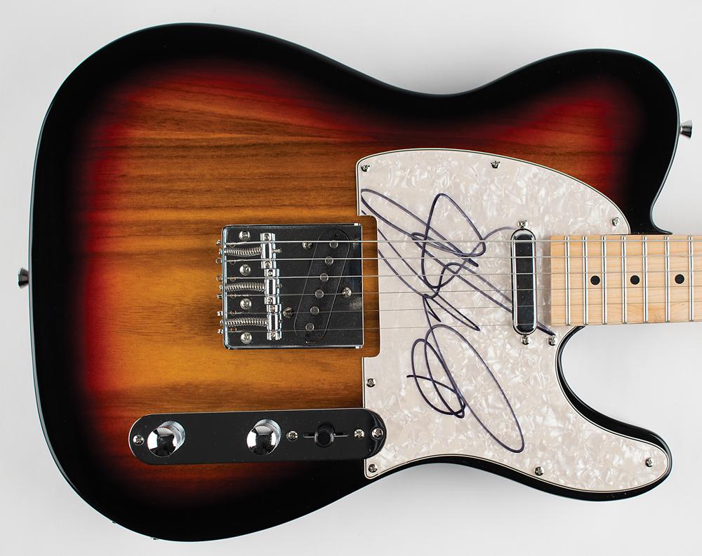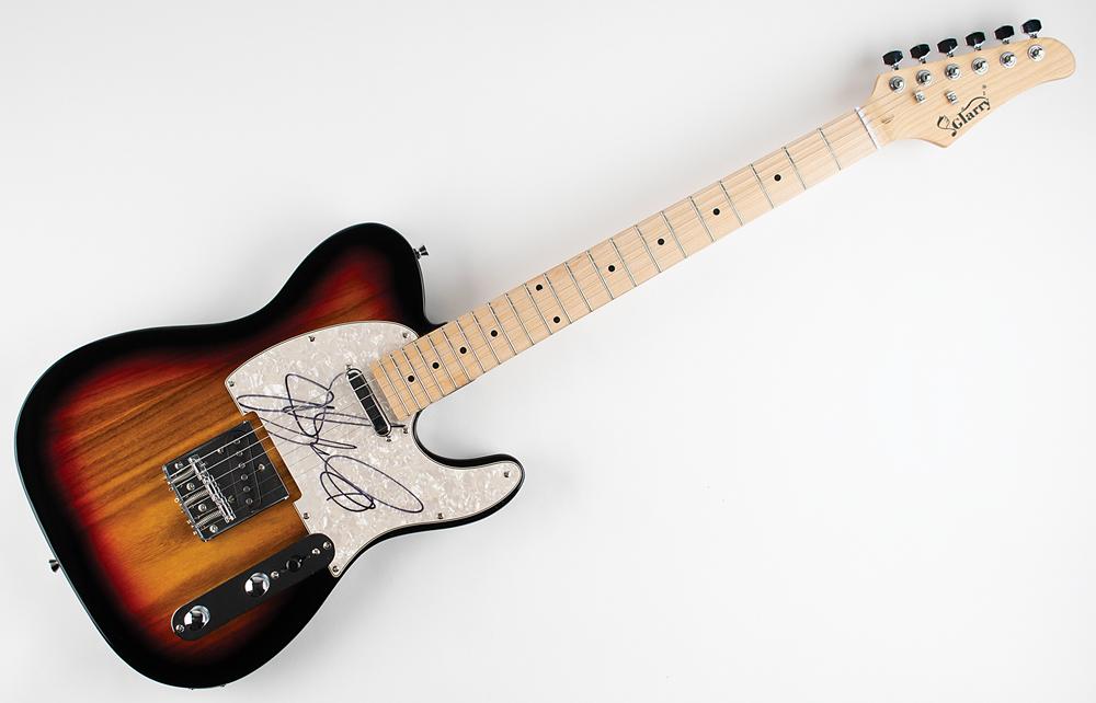 Attractive black-bodied Glarry Telecaster-style electric guitar with a sunburst finish, signed on the pearloid pickguard in black felt tip by Bruce Springsteen. In fine condition.