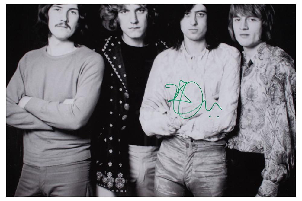 Satin-finish 15 x 10 photo of Led Zeppelin in November 1968, signed in green felt tip by Robert Plant. In fine condition.