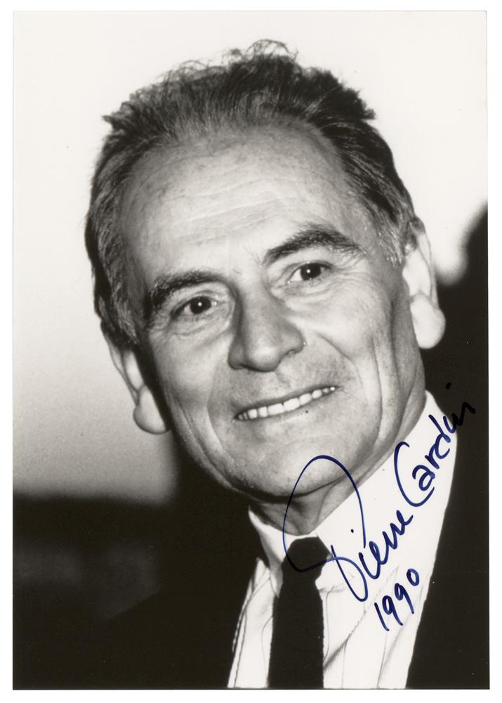 Italian-born French fashion designer (1922-2020) known for his avant-garde style and Space Age designs. Glossy 3.5 x 5 close-up photo, signed in black felt tip, "Pierre Cardin, 1990." In fine condition.