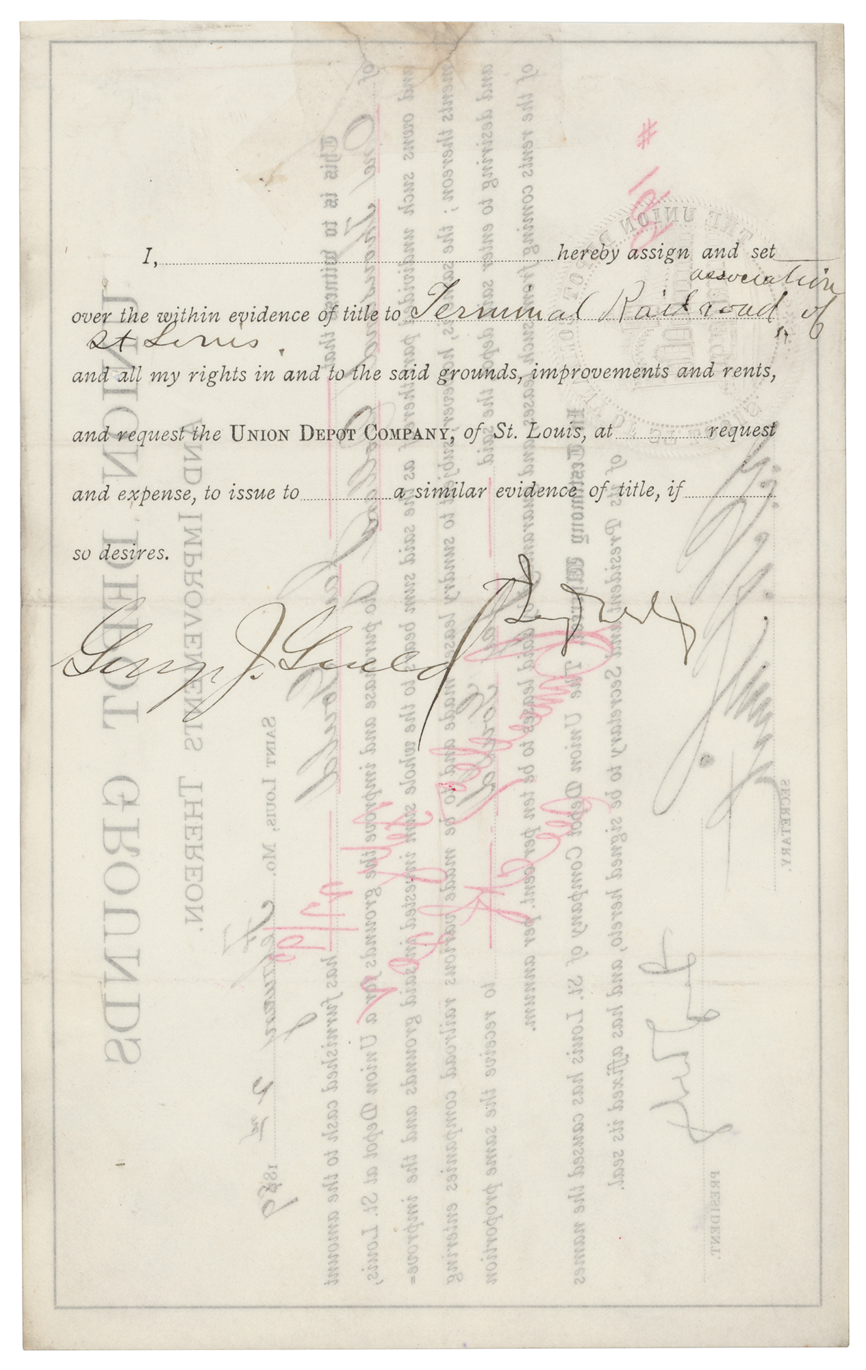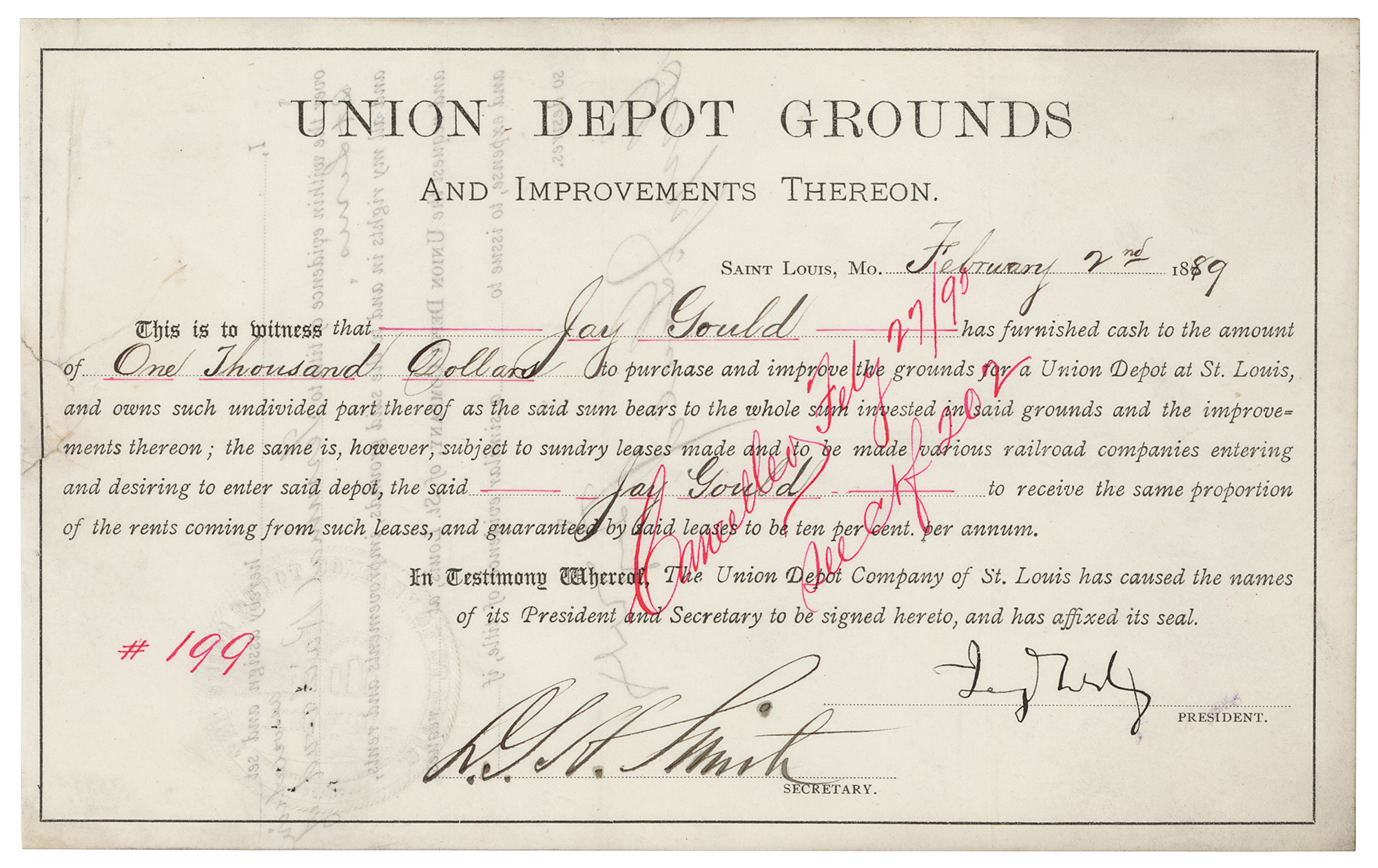 Financier (1836-1892) known for his stock market manipulation of railroad securities; he also tried to corner the gold market, leading to the 'Black Friday' stock market crash of September 1869. Partly-printed DS, one page, 9.25 x 6, February 2, 1889. Union Depot Grounds receipt certifying that "Jay Gould has furnished cash to the amount of One Thousand Dollars to purchase and improve the grounds for a Union Depot at St. Louis," signed at the conclusion by Gould as the company's president and countersigned by a secretary. In fine condition, with small repairs to the left edge.