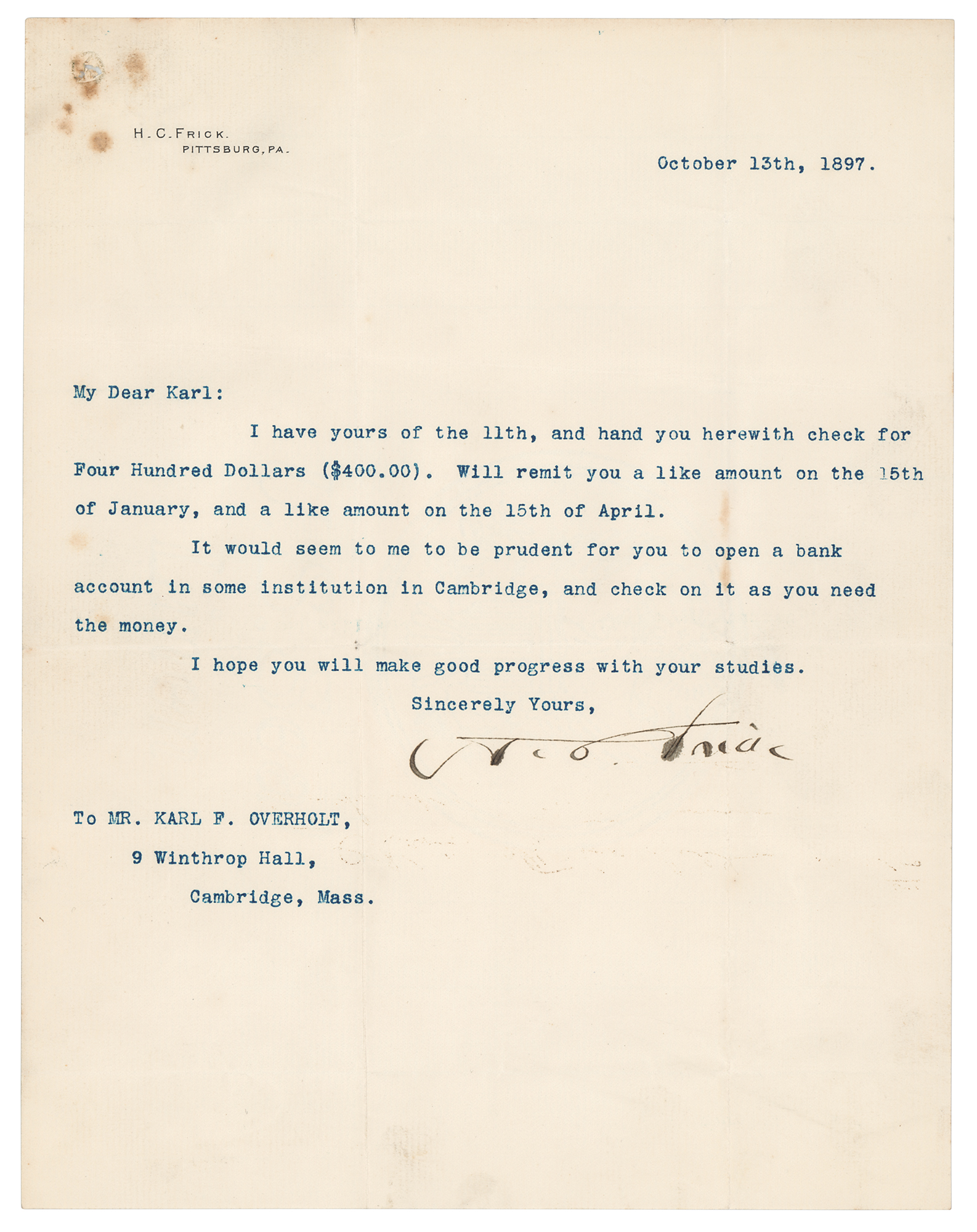 Prominent American industrialist (1849-1919) who served as president of U.S. Steel and assembled a world-class art collection now housed in the New York museum that bears his name. TLS signed “H. C. Frick,” one page, 8 x 10, personal letterhead, October 13, 1897. Letter to Karl Overholt in Cambridge, Massachusetts, in part: "I have yours of the 11th, and hand you herewith check for Four Hundred Dollars?It would seem to me to be prudent for you to open a bank account in some institution in Cambridge, and check on it as you need the money. I hope you will make good progress with your studies." In very good to fine condition, with overall creasing, and scattered small stains.