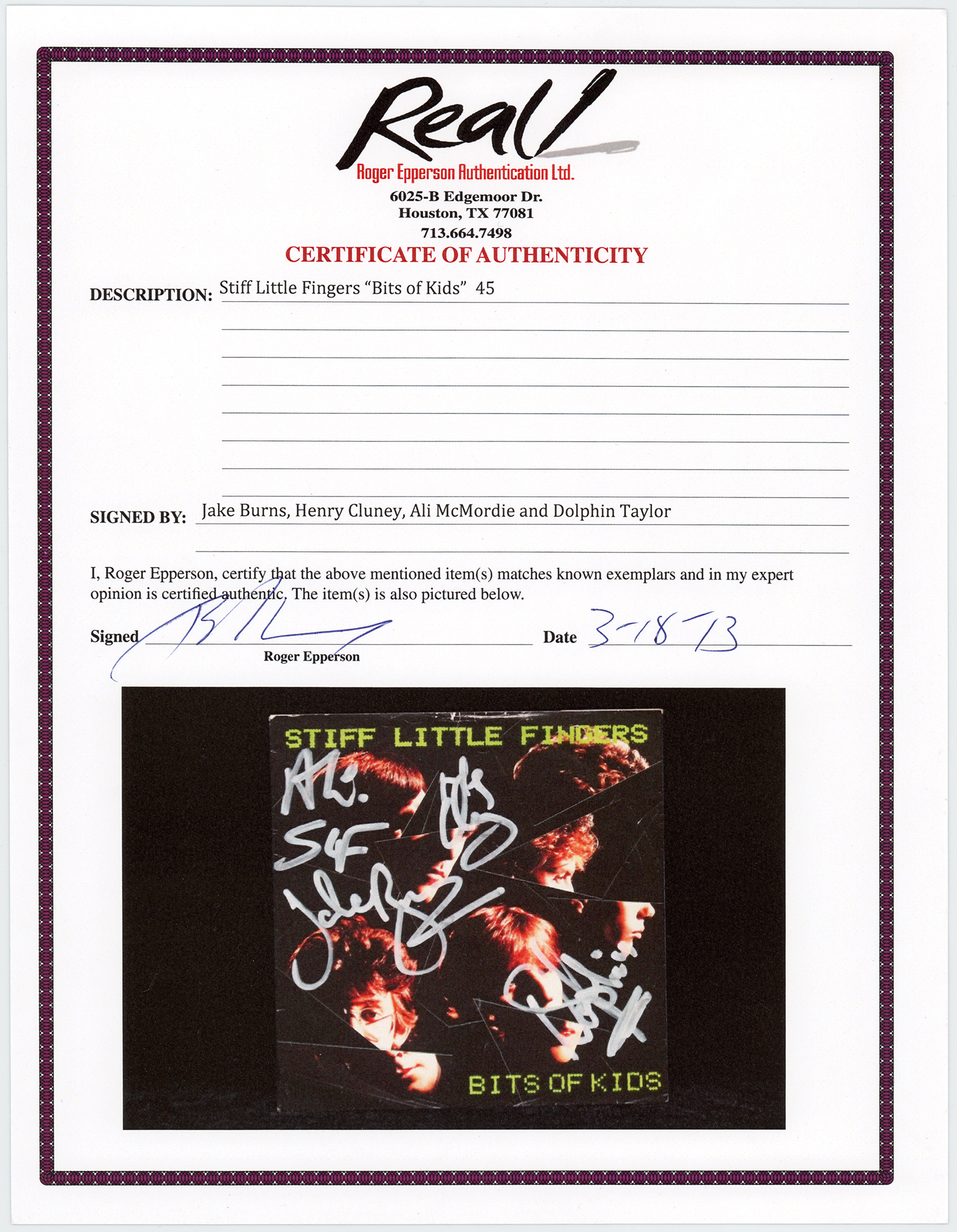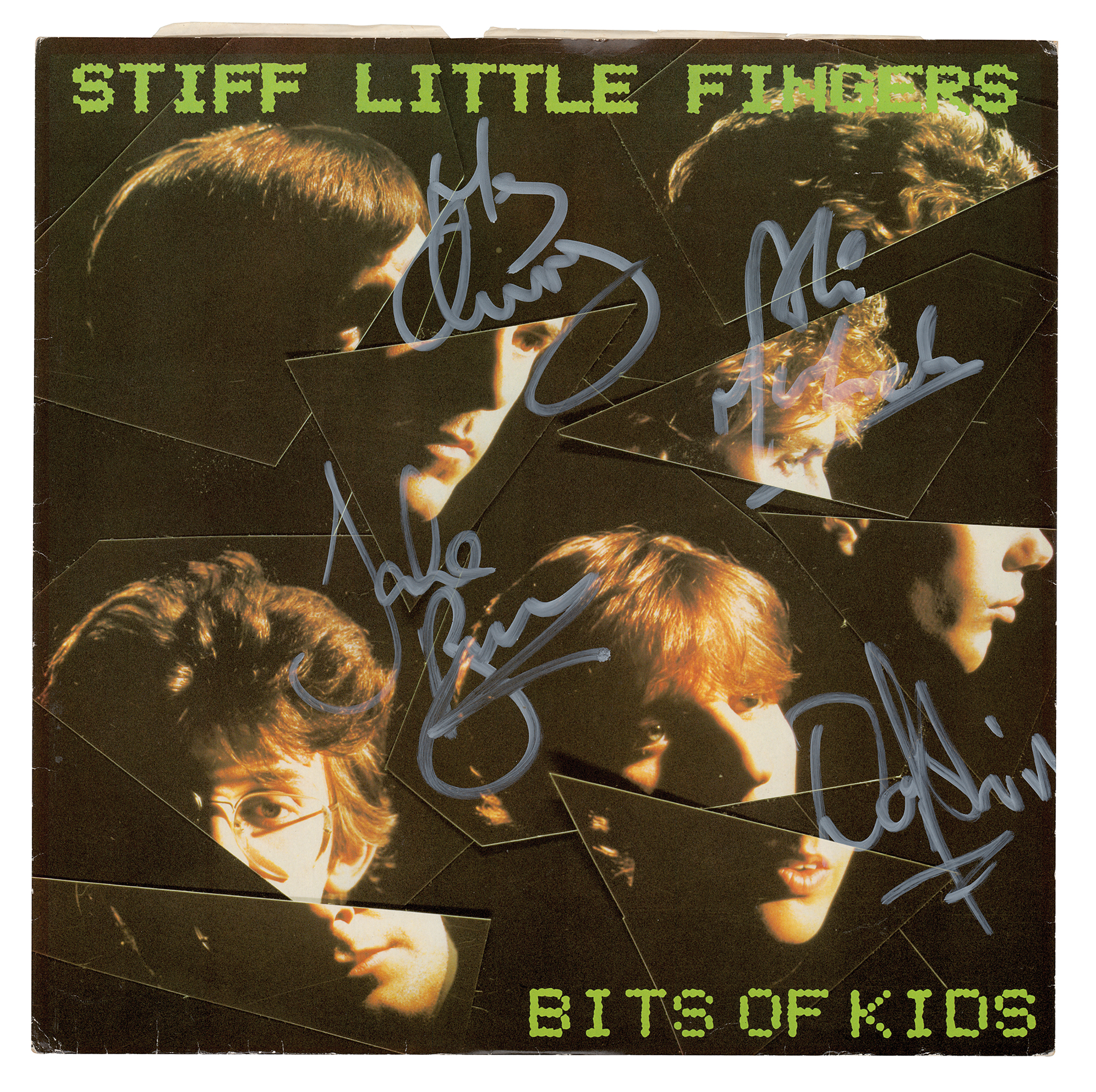 12″ and 7″ album singles for 'Bits of Kids / Stands to Reason' by Stiff Little Fingers, both signed on the front cover in white paint pen by Jake Burns, Ali McMordie, Henry Cluney, and Dolphin Taylor. In overall very good to fine condition, with creasing to the 7″ sleeve. The 7″ record is included. Accompanied by a full letter of authenticity from REAL for the 7″ single.