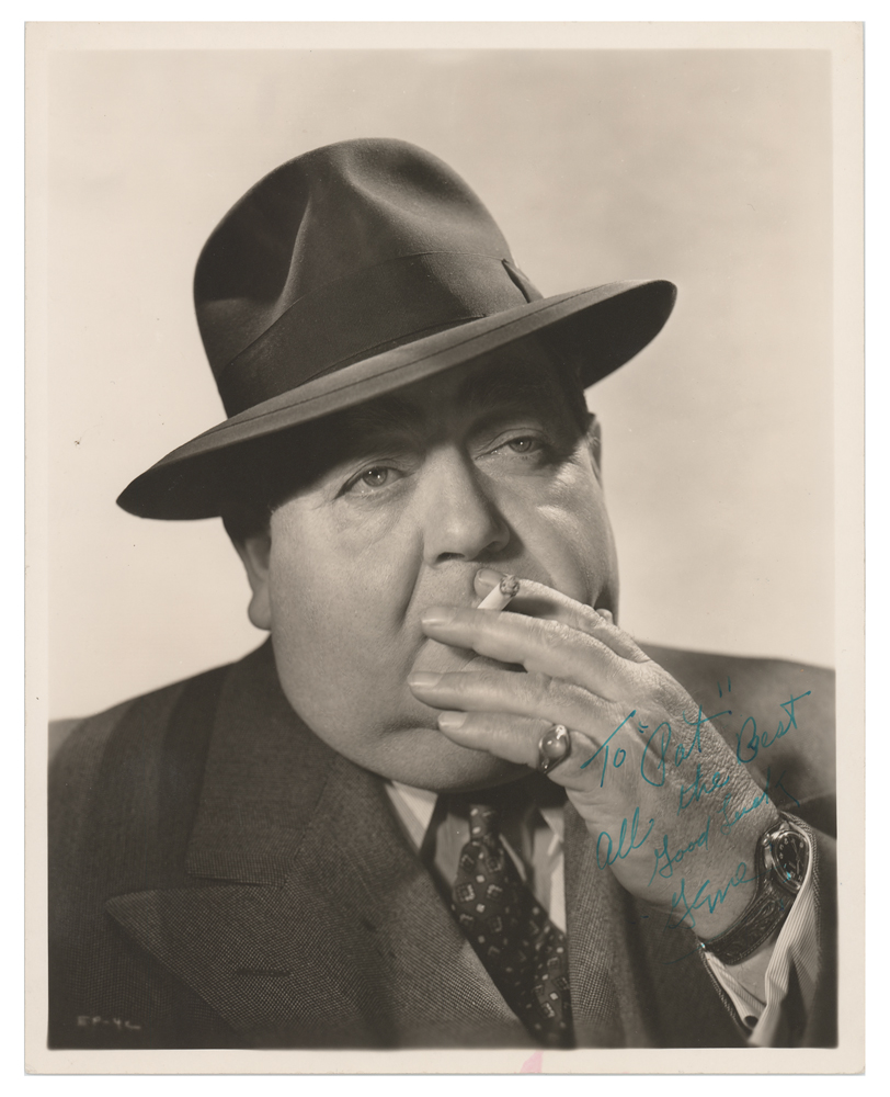 Vintage matte-finish 8 x 10 photo of Eugene Pallette smoking a cigarette, signed and inscribed in blue ink, "To 'Pat,' All the best, Good luck, Gene.” In fine condition.