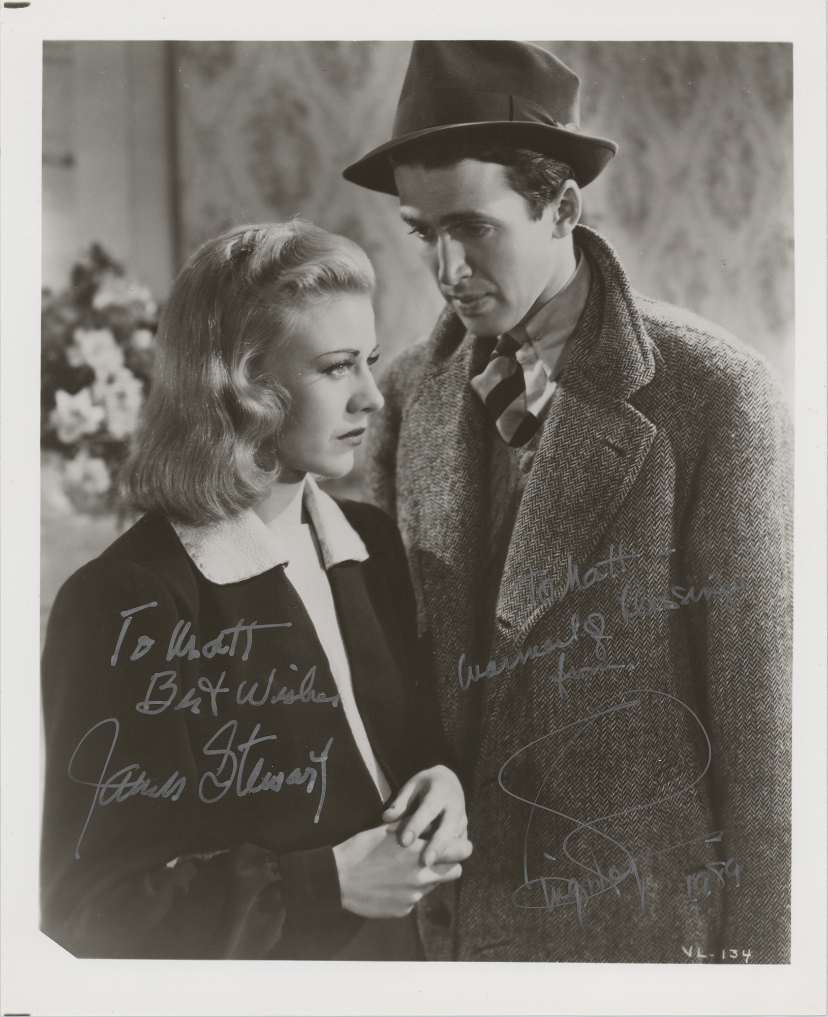 Glossy 8 x 10 photo of Stewart and Rogers from the 1938 romantic comedy Vivacious Lady, signed and inscribed in silver ink, "To Matt, Best wishes, James Stewart" and "To Matt—Warmest of blessings from Ginger Rogers, 1989.” In fine condition, with a crease to the upper left corner tip, and a paperclip impression to the top edge.