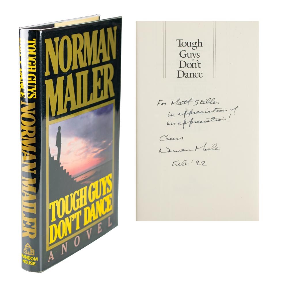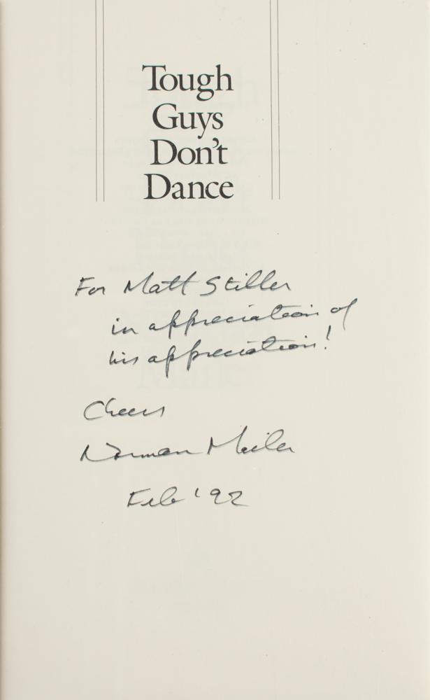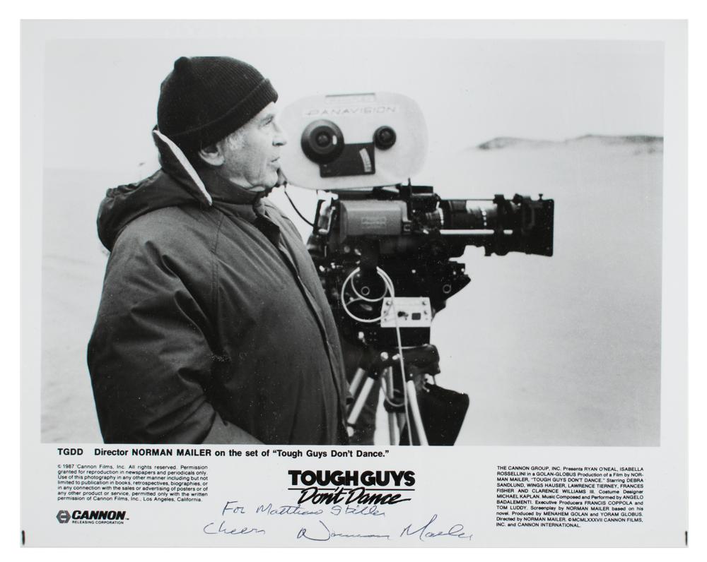 Two items: a glossy 10 x 8 Cannon Films publicity photo of Norman Mailer during production of the 1987 film Tough Guys Don't Dance, signed and inscribed in black ballpoint, “For Matthew Stiller, Cheers, Norman Mailer”; and a first Random House edition of Tough Guys Don't Dance, hardcover with dust jacket, published by Random House in 1984, signed and inscribed on the half-title page in black felt tip, “For Matt Stiller, in appreciation of his appreciation! Cheers, Norman Mailer, Feb ‘92.” Also includes a typed letter from Mailer from December 18, 1989, which is signed in a secretarial hand. In overall fine condition.