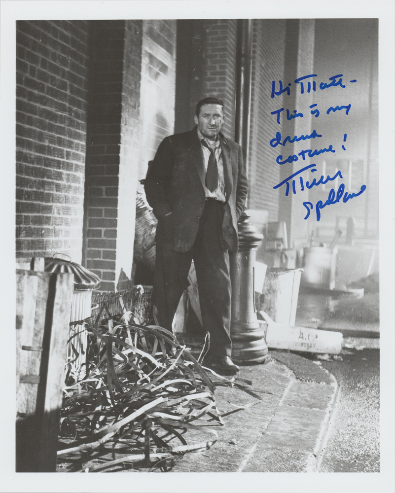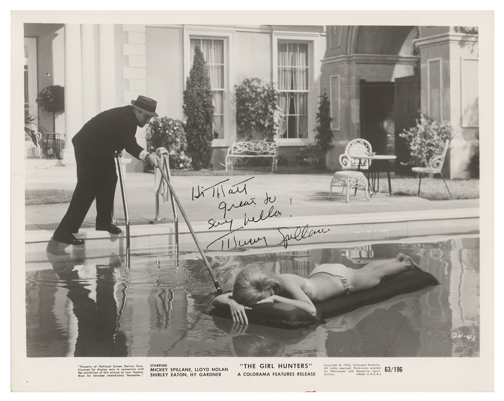 Two glossy photos: an 8 x 10 full-length photo of Spillane looking rather disheveled in The Girl Hunters, signed and inscribed in blue felt tip, "Hi Matt—This is my drunk costume! Mickey Spillane"; and a 10 x 8 publicity photo for the same film, signed and inscribed in black ink, "Hi Matt, Great to say hello! Mickey Spillane." In overall very good to fine condition, with a vertical bend to the scene photo.