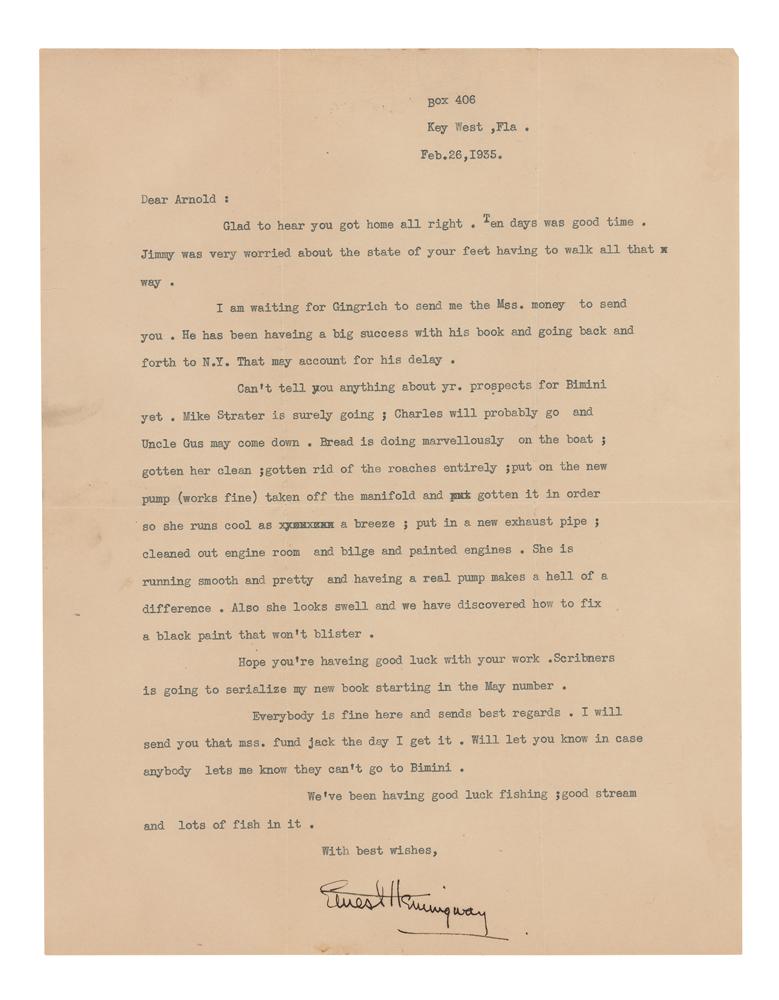 TLS, one page, 8.5 x 11, February 26, 1935. Letter to Arnold Samuelson, in part: "I am waiting for Gingrich to send me the Mss. money to send you. He has been haveing [sic] a big success with his book and going back and forth to N.Y. That may account for his delay. Can't tell you anything about yr. prospects for Bimini yet. Mike Strater is surely going; Charles will probably go and Uncle Gus may come down. Bread is doing marvellously on the boat; gotten her clean; gotten rid of the roaches entirely; put on the new pump (works fine) taken off the manifold and gotten it in order so she runs cool as a breeze; put in a new exhaust pipe; cleaned out engine room and bilge and painted engines. She is running smooth and pretty and haveing [sic] a real pump makes a hell of a difference. Also she looks swell and we have discovered how to fix a black paint that won't blister. Hope you're haveing [sic] luck with your work. Scribners is going to serialize my new book starting in the May number. Everybody is fine here and sends best regards. I will send you that mss. fund jack the day I get it. Will let you know in case anybody lets me know they can't go to Bimini. We've been having good luck fishing; good stream and lots of fish in it." In fine condition, with light soiling. Accompanied by the original mailing envelope.