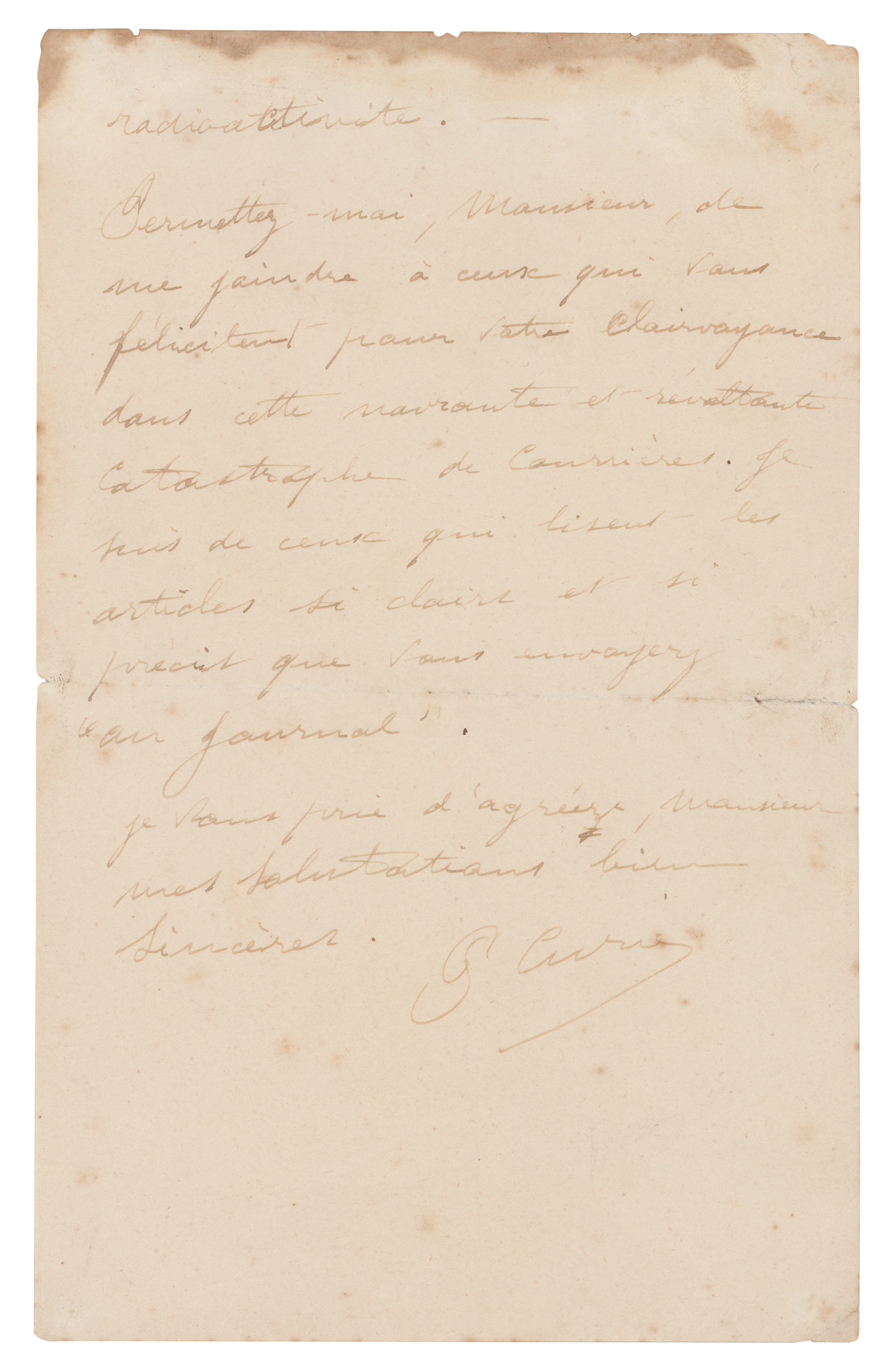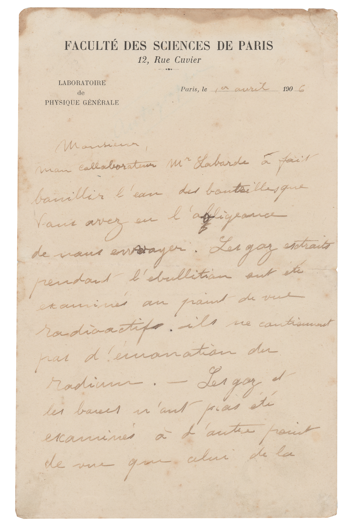 French physicist (1859-1906) best known for his pioneering investigation of radioactivity, who shared the 1903 Nobel Prize in Physics with his wife, Marie Curie. ALS in French, signed “P. Curie,” two pages, 5.25 x 8.25, Faculte des Sciences de Paris letterhead, April 1, 1906. Letter with important scientific content referring to radiation. In part (translated): "My collaborator Mr. Labarde boiled the water from the bottles you had the kindness to send us. The gases we have extracted during the ebullition have been examined under radioactive point of view. They do not contain radium emanation." Curie further congratulates his correspondent for his clear-sightedness on a pathetic and revolting affair, before concluding, saying: "I am one of those who read the articles so clear and so precise." In fine condition, with staining along the top edge. Pierre Curie’s letters are very rare, especially with such significant scientific content.