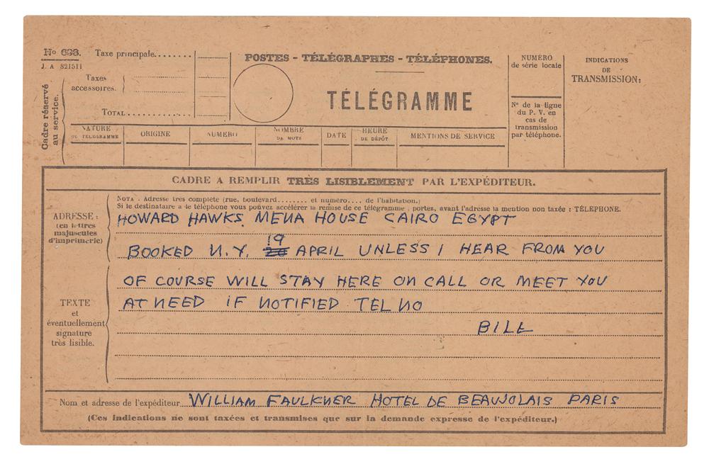 ALS signed “Bill,” one page, 8.25 x 5.25, no date. Handwritten telegram by William Faulkner to Hollywood director Howard Hawks, in full: "Booked NY 19 April unless I hear from you. Of course will stay here on call or meet you at need if notified." Along the bottom, he writes: "William Faulkner, Hotel de Beaujolais, Paris." In fine condition. Faulkner contributed to the screenplay for the adaptation of Hemingway's To Have and Have Not in 1944, as well as The Big Sleep in 1946—both classic films directed by Howard Hawks.