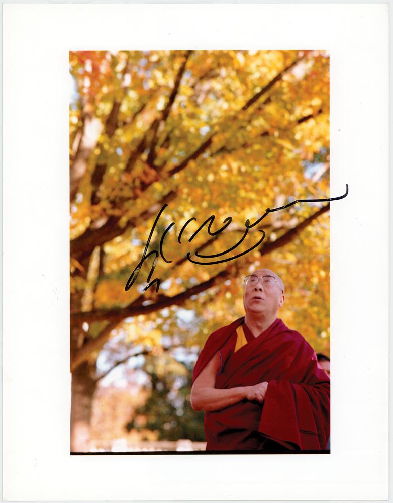 Color glossy 8.5 x 11 photo of the Dalai Lama in his iconic robes, signed in black felt tip. In fine condition. Originally obtained by in-person specialist Mike Wehrmann.