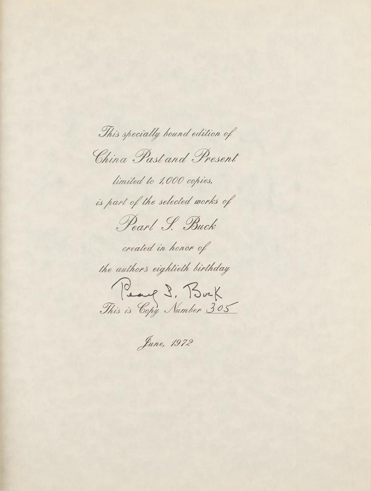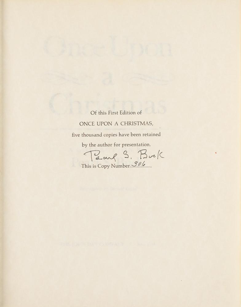 Two limited edition signed books, both hardcovers with dust jackets: China: Past and Present, published by The John Day Company in 1972, numbered 305/1000, signed on the colophon in black felt tip, "Pearl S. Buck"; and Once Upon a Christmas, published by The John Day Company in 1972, numbered 306/5000, signed on the colophon in black felt tip, "Pearl S. Buck." In overall fine condition, with price-clipped dust jackets. Illustrated with images captured by great Magnum photographers like Henri Cartier-Bresson and Marc Riboud, paired with Buck's commentary, China: Past and Present is a work of particular significance.