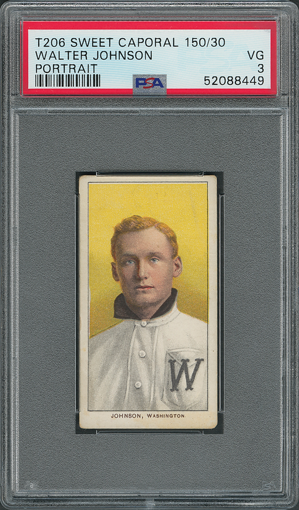 Graded by PSA VG 3. Probably the most popular card of the 'Big Train,' this is one of the key Hall of Fame portraits in the T206 set. Shown early in his career with the Washington Senators' "W" emblazoned on his uniform, Walter Johnson's steely visage stands out against the bright yellow background. Well-centered both front and back, this is a classic card with fantastic eye-appeal for the grade.