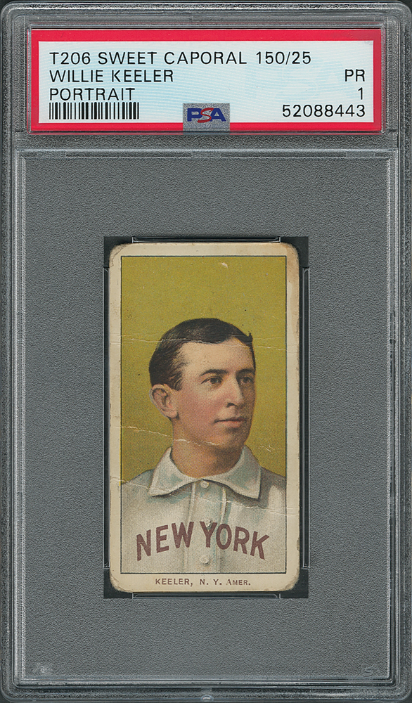 Graded by PSA PR 1. Another key Hall of Fame portrait in the T206 set, this card shows Willie Keeler in his New York uniform. Standing at 5´ 4″ and weighing just 140 pounds, 'Wee Willie' was yet a towering figure in the batter's box: regarded as one of the greatest contact hitters of all time, he was nearly impossible to strike out and finished his career with a .341 batting average. Rounded corners, light staining, and a few creases mar this well-centered, well-loved card of the two-time NL batting champ.