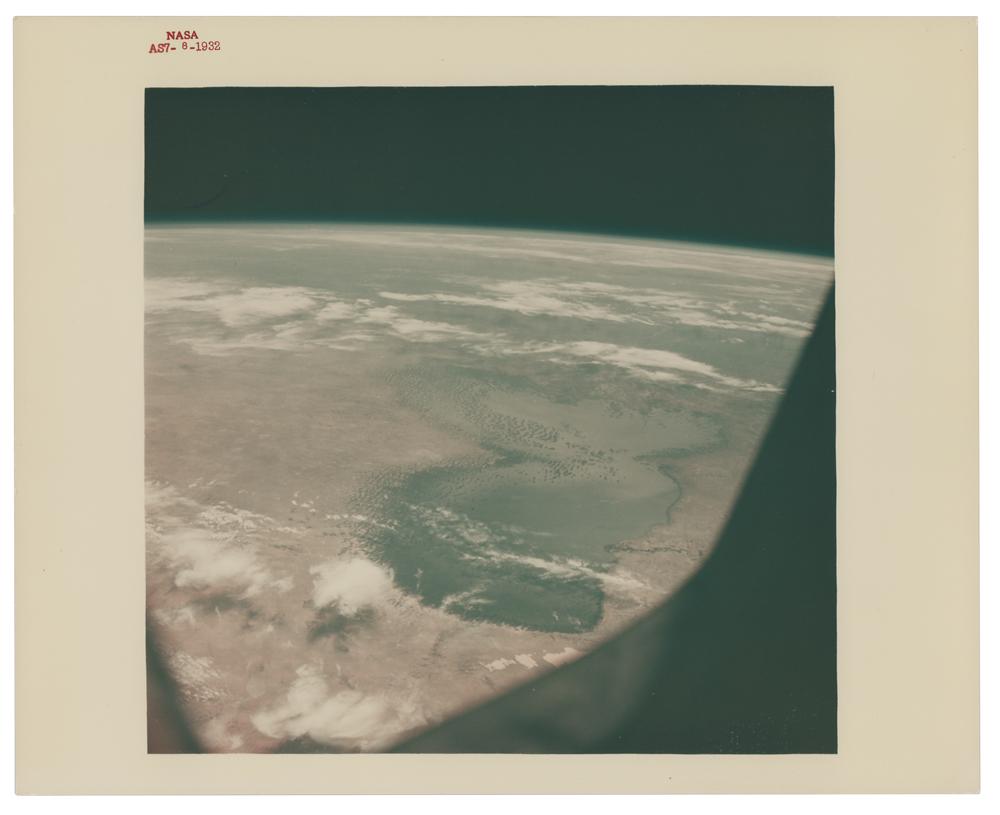 Official color glossy 10 x 8 red-numbered NASA (AS7-8-1932) photo from the personal collection of NASA technician Richard Underwood, who worked in the Johnson Space Center’s Photographic Technology Laboratory for over two decades. The photo, as viewed from the Apollo 7 CSM, shows the immense Lake Chad in central Africa. Reverse bears “A Kodak Paper” watermarks. In fine condition. Accompanied by a signed certificate of authenticity from Florian Noller of Artifact Cloud, and by a copy of the original certificate of authenticity from the Richard Underwood estate. Underwood was responsible for developing the Apollo photographs—in fact, he was the first person to view every photograph from the Gemini, Apollo, Skylab, Apollo-Soyuz, and the first 23 space shuttle missions.