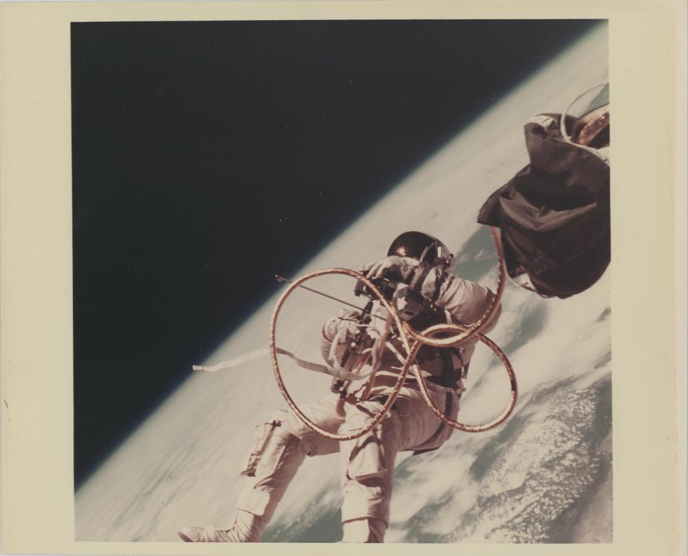 Official color glossy 10 x 8 NASA photo from the personal collection of NASA technician Richard Underwood, who worked in the Johnson Space Center’s Photographic Technology Laboratory for over two decades. The photo shows astronaut Ed White performing his historic first American spacewalk during the Gemini 4 mission; visible in the far distance is southern California. Reverse bears “A Kodak Paper” watermarks. In fine condition, with trivial toning. Accompanied by a signed certificate of authenticity from Florian Noller of Artifact Cloud, and by a copy of the original certificate of authenticity from the Richard Underwood estate. Underwood was responsible for developing the Apollo photographs—in fact, he was the first person to view every photograph from the Gemini, Apollo, Skylab, Apollo-Soyuz, and the first 23 space shuttle missions.