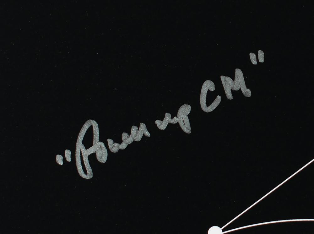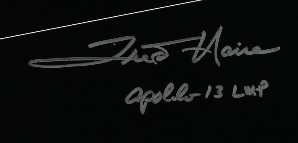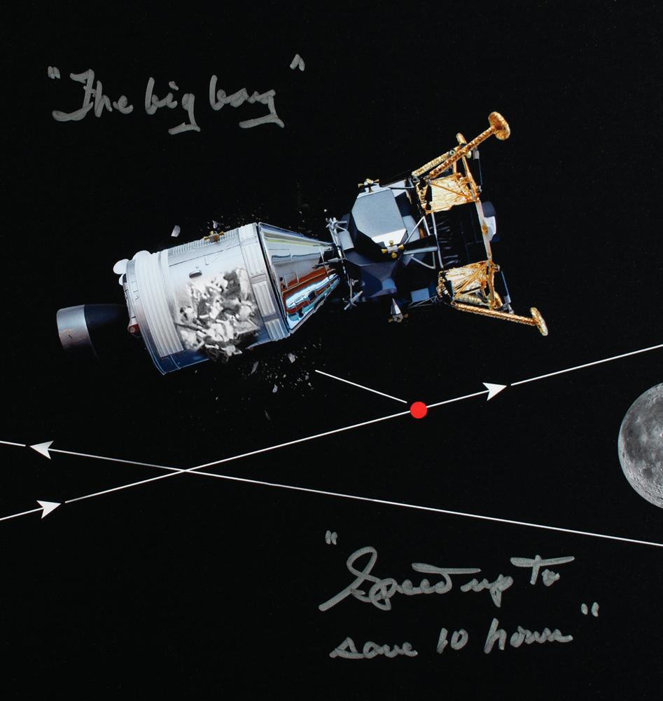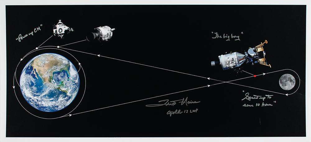 Color semi-glossy 23.25 x 10.5 panoramic photo of the damaged service module and the flight path for the crew of Apollo 13, signed in silver ink, "Fred Haise, Apollo 13 LMP," who adds notes to three integral moments of the harrowing inbound flight: "Speed up to save 10 hours," "The big bang," and "Power up CM." In fine condition.
