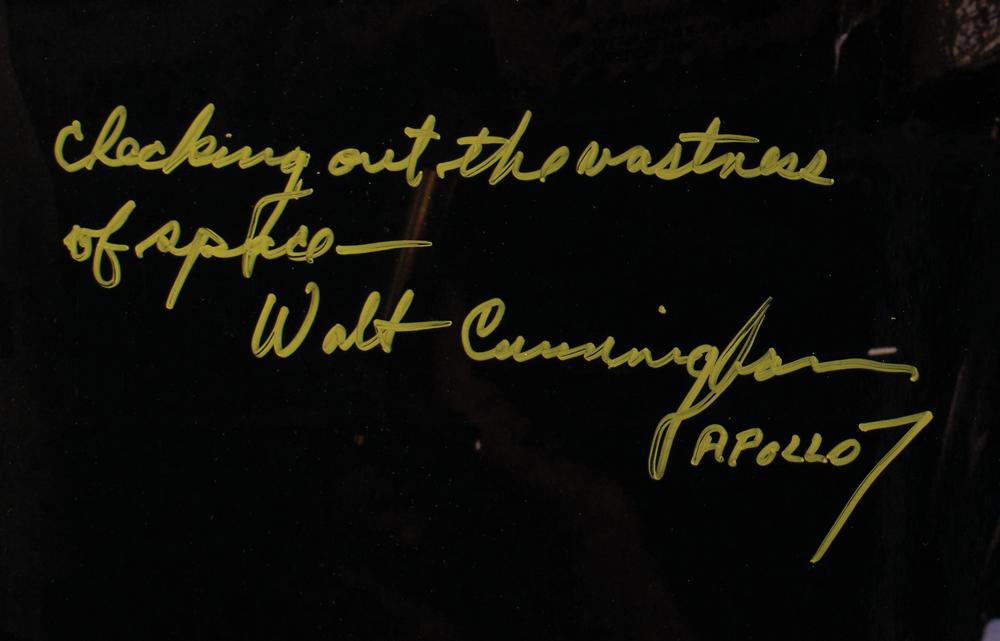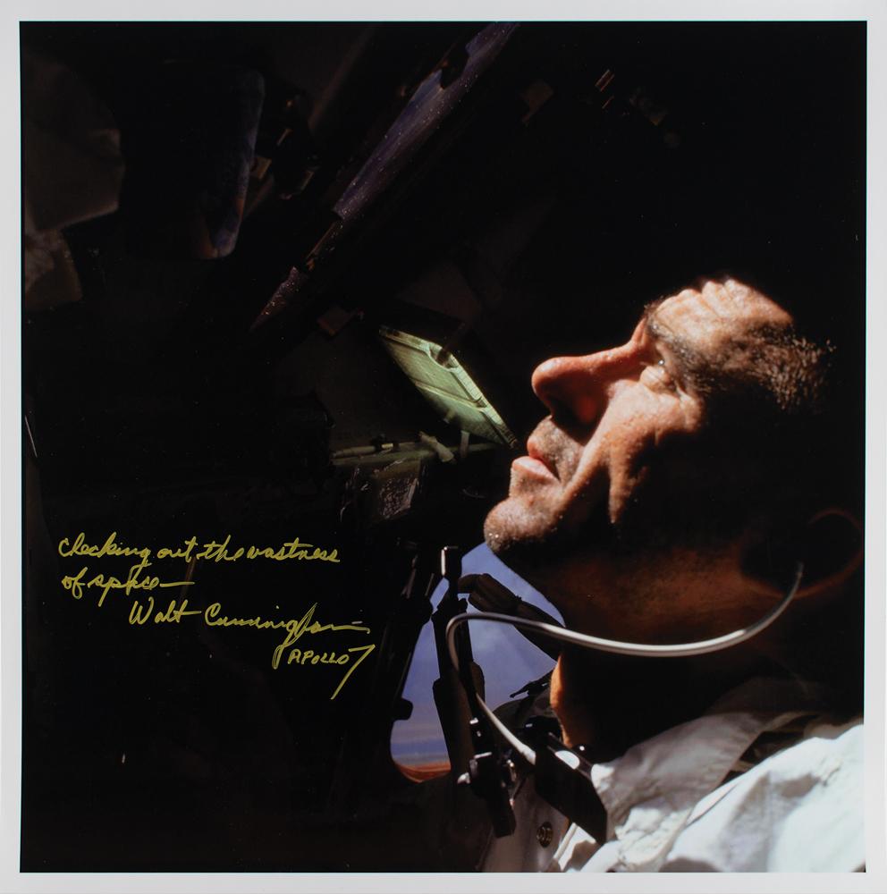 Color glossy 16.5 x 16.5 close-up photo of LMP Cunningham peering out the window of the Apollo CSM-101 spacecraft during the Apollo 7 mission, signed in gold ink, "Checking out the vastness of space—Walt Cunningham, Apollo 7." In very fine condition.