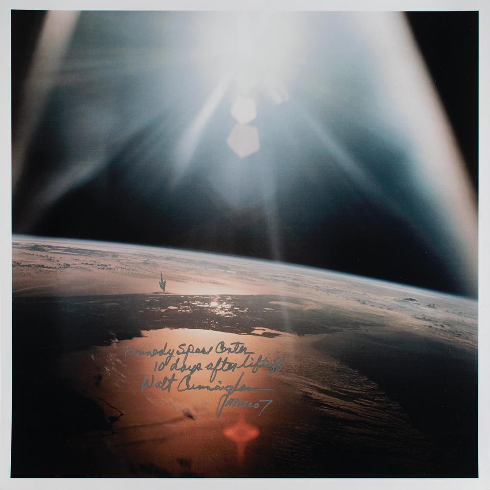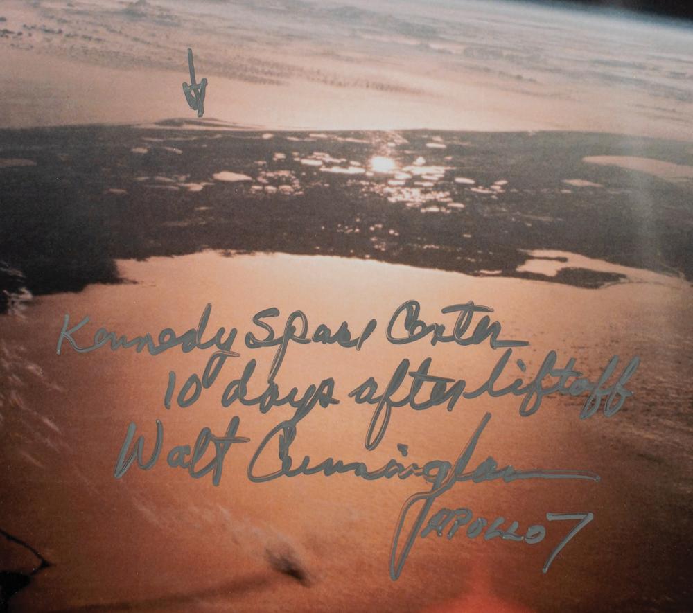 Color glossy 16.5 x 16.5 photo of Merritt Island, Florida as viewed from space during the Apollo 7 mission, signed in silver ink by Walt Cunningham, who adds "Apollo 7" and a small arrow pointing to "Kennedy Space Center, 10 days after liftoff." In fine condition.