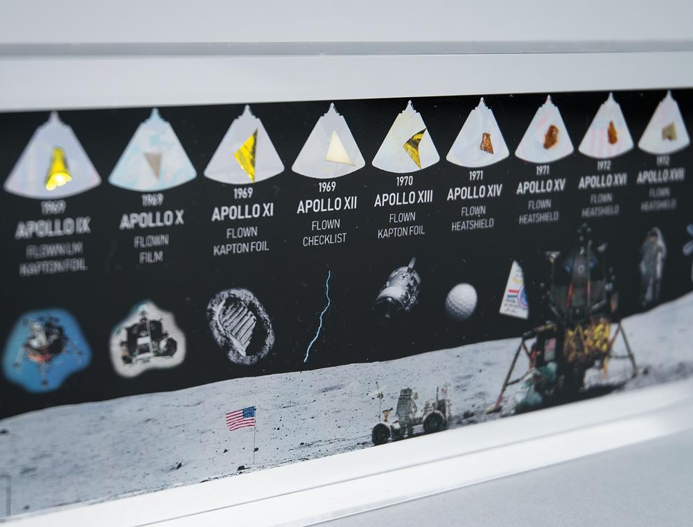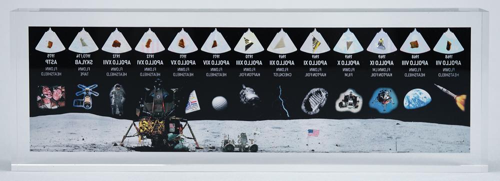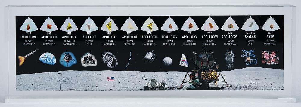 Limited edition acrylic display containing small fragments from the spacecraft of each Apollo manned mission, as well as from the Skylab and the Apollo-Soyuz missions; all of which are attested to as being flown by Florian Noller. The missions and material: Apollo 7 (heat shield), Apollo 8 (heat shield), Apollo 9 (Kapton foil), Apollo 10 (film), Apollo 11 (Kapton foil), Apollo 12 (checklist), Apollo 13 (Kapton foil), Apollo 14 (heat shield), Apollo 15 (heat shield), Apollo 16 (heat shield), Apollo 17 (heat shield), Skylab (tape), and ASTP (heat shield). The acrylic block measures 11.75″ x 4″ x 1.25″, with only 25 displays produced. In fine condition. Accompanied by a certificate of authenticity from Florian Noller of Artifact Cloud, with supporting documentation for the relics.