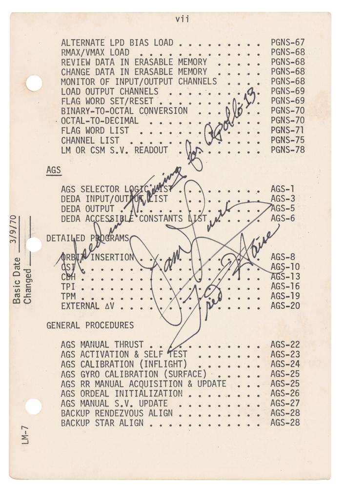 Double-sided page taken from a training-used Apollo 13 Lunar Module Flight Crew G & N Dictionary, 5.5 x 8, signed on one side in black felt tip, "Used in training for Apollo 13, Fred Haise," and "James Lovell." The checklist pages, “vii” and “viii,” list various sections related to the Abort Guidance System and Primary Guidance and Navigation System. In fine condition. Accompanied by a photocopy of the front cover of the manual, which was annotated "LMS2," referring to Lunar Module Simulator-2 where Haise and Lovell trained at Kennedy Space Center. Creative troubleshooting would, of course, become vital to the crew's survival after the explosion of an oxygen tank on the LM Aquarius.