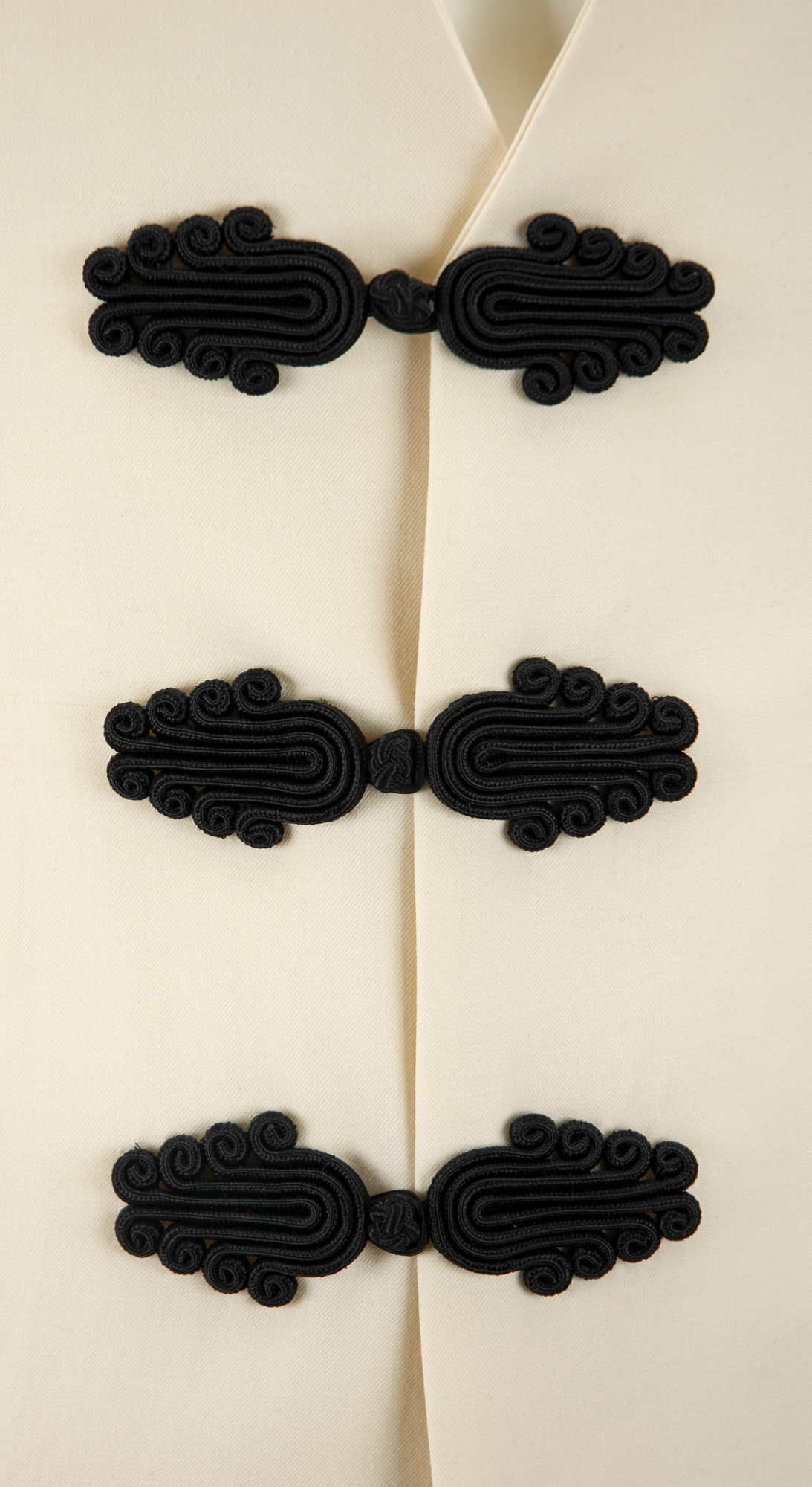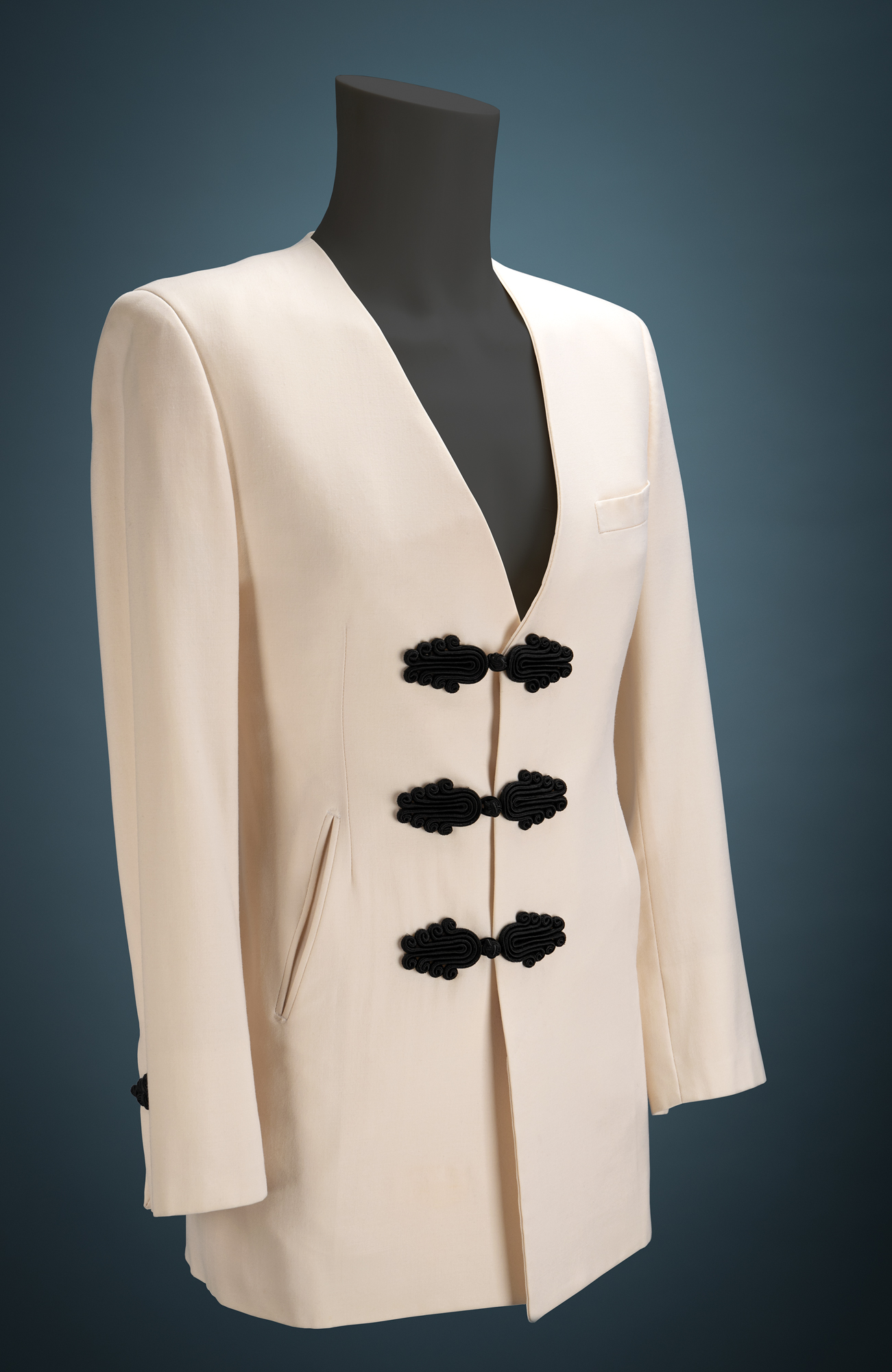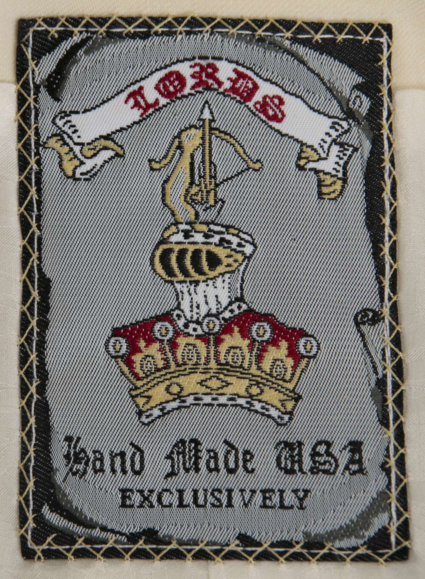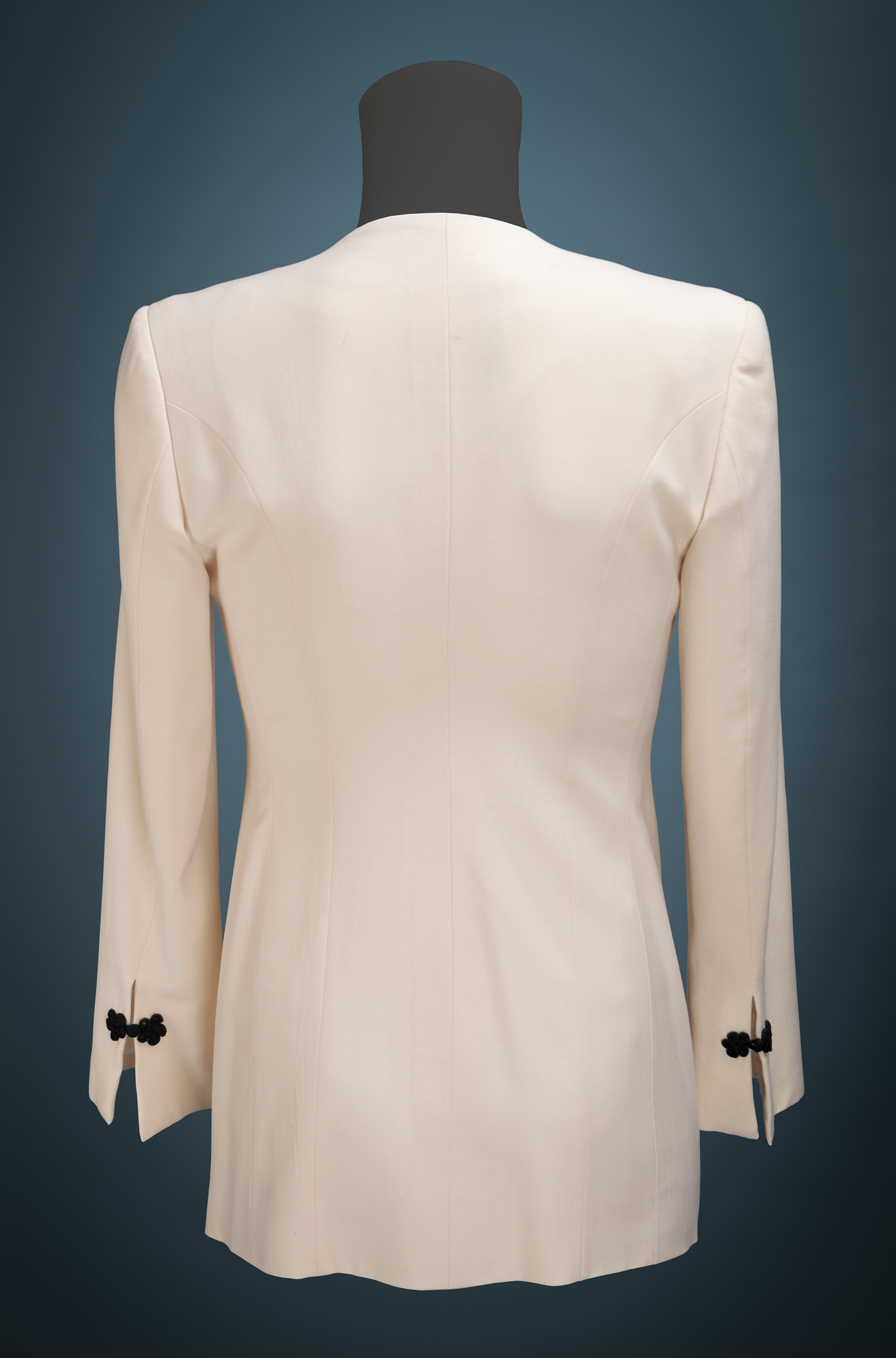 Prince's personally-owned handmade couture jacket worn in a photo shoot, crafted from cream-colored fabric with three pairs of ornate black corded rope clasps on the front, and matching rope links on the cuffs. Concealed in the placket are three white buttons, behind each set of clasps. The jacket has two jetted diagonal pockets, handkerchief pocket on left breast, and is lined in a fine paisley satin. The label sewn into the neck area reads: "Lords, Hand Made USA, Exclusively." The inner pocket has a tag annotated: "Lords, Name: Prince, Date: 5/18/05." In fine condition.