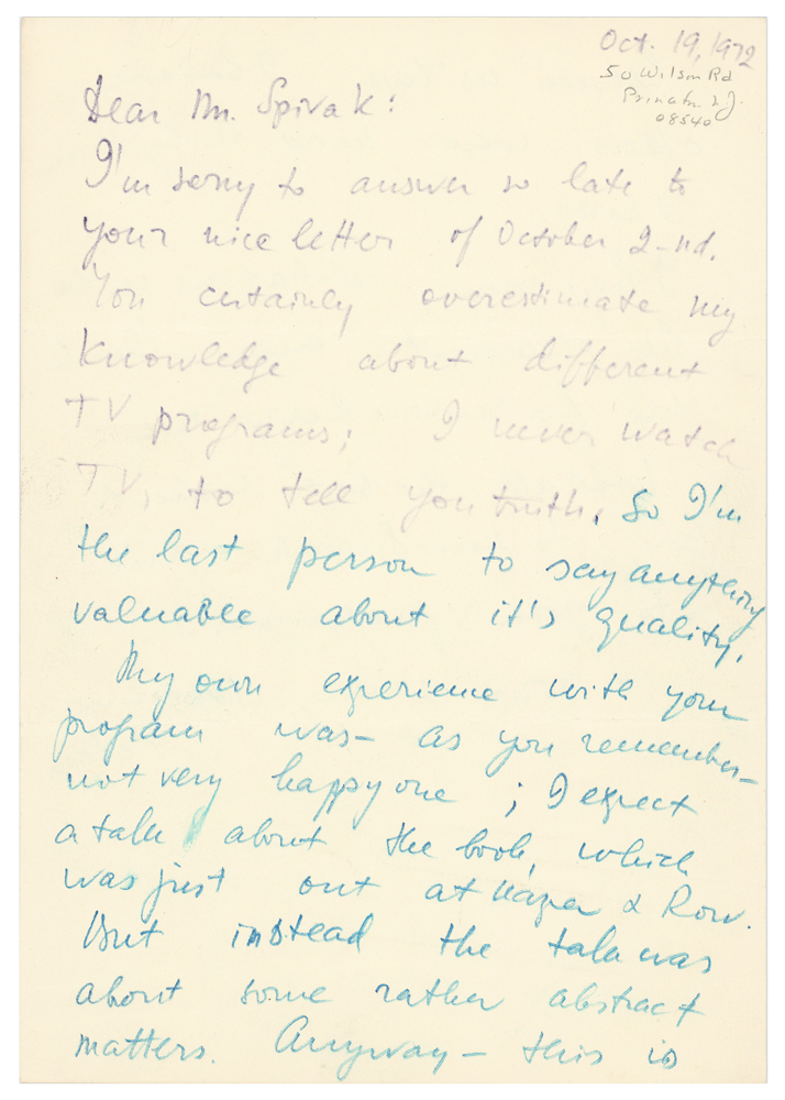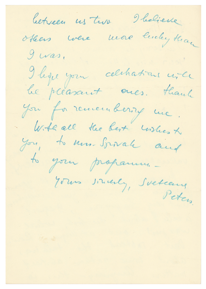 Youngest child and only daughter (1926-2011) of Soviet Premier Joseph Stalin and Nadezhda Alliluyeva; later known as Lana Peters, she caused an international furor when she defected and became a naturalized citizen of the United States in 1967. Uncommon ALS signed “Svetlana Peters,” one page, 7.25 x 10.25, October 19, 1972. Letter to journalist and Meet the Press founder Lawrence Spivak, in part: "You certainly overestimate my knowledge about different TV programs; I never watch TV, to tell you the truth. So I'm the last person to say anything valuable about it's quality. My own experience with your program was—as you remember—not very happy one; I expect a talk about the book, which was just out at Harper & Row. But instead the talk was about some rather abstract matters. Anyway—this is between us two. I believe others were more lucky than I was. I hope your celebrations will be pleasant ones. Thank you for remembering me. With all the best wishes to you, to Mrs. Spivak and to your programs." In fine condition. She had appeared on a historic 1969 episode of Meet the Press, two years after defecting to the US. In her interview, she strongly condemned her father’s policies and pleaded for the Soviet Union to abandon Communism.
