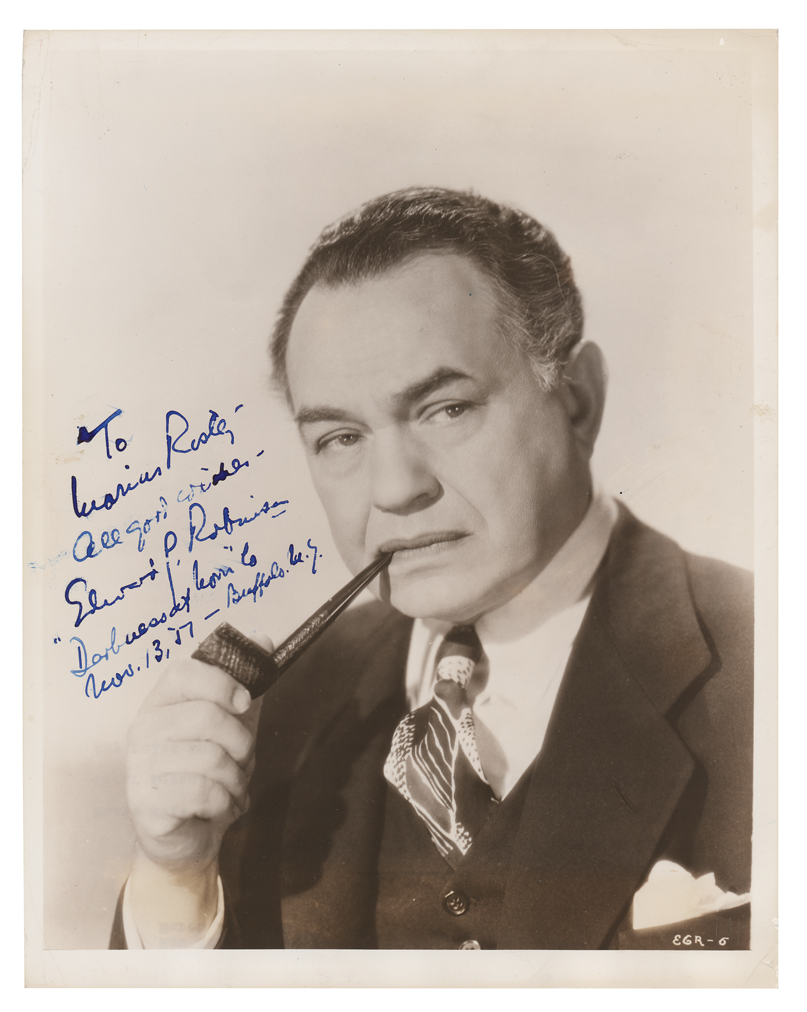 Vintage glossy 8 x 10 photo of Robinson with a pipe in a distinguished bust-length pose, signed and inscribed in blue fountain pen, "?All good wishes, Edward G. Robinson, 'Darkness at Noon,'?Nov. 13, 51‚ Buffalo, N. Y.” In very good to fine condition, with scattered light creasing, a heavier crease across the bottom, and a light paperclip impression to the top edge.
