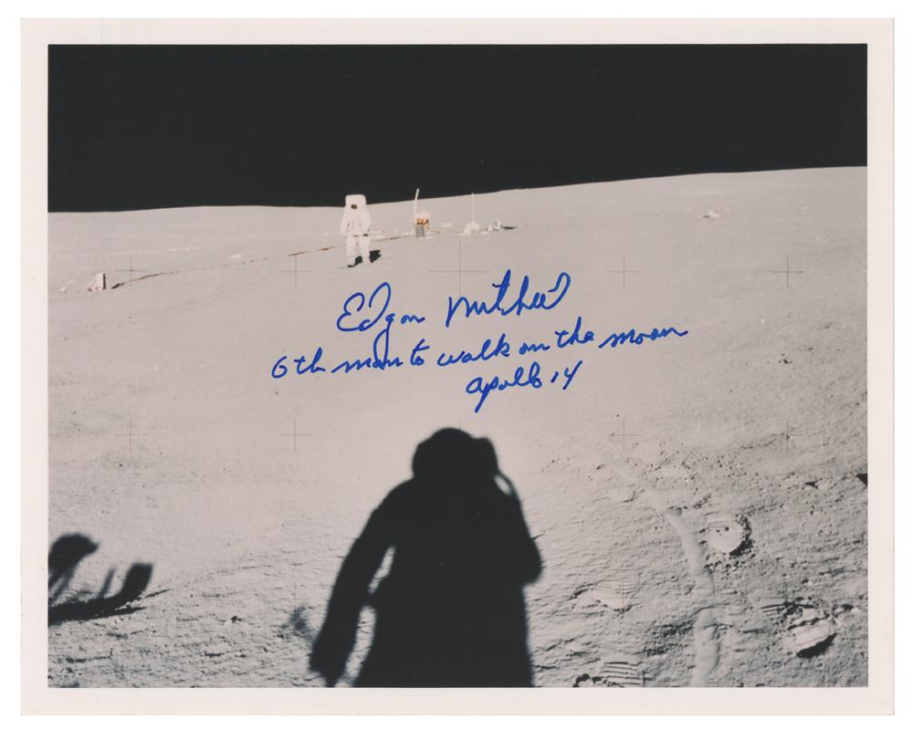 Color semi-glossy 10 x 8 photo of LMP Mitchell walking away from the ALSEP (Apollo Lunar Surface Experiments Package) during the Apollo 14 mission, signed in blue felt tip, "Edgar Mitchell, 6th man to walk on the moon, Apollo 14." In fine condition.