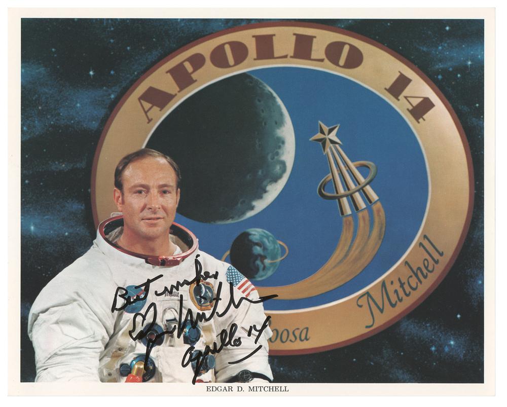 Official color 10 x 8 NASA lithograph of LMP Mitchell posing in his white space suit against a backdrop bearing the Apollo 14 mission insignia, signed in black felt tip, "Best wishes, Edgar Mitchell, Apollo 14." In fine condition.