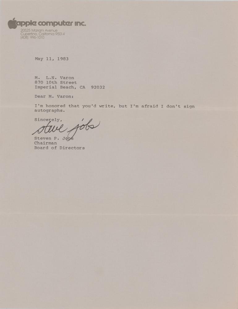 TLS signed ?steve jobs,? one page, 8.5 x 11, Apple Computer, Inc. letterhead, May 11, 1983. Letter to L. N. Varon in Imperial Beach, California, in full: "I'm honored that you'd write, but I'm afraid I don't sign autographs." In fine condition, with a small stain in the lower blank area.